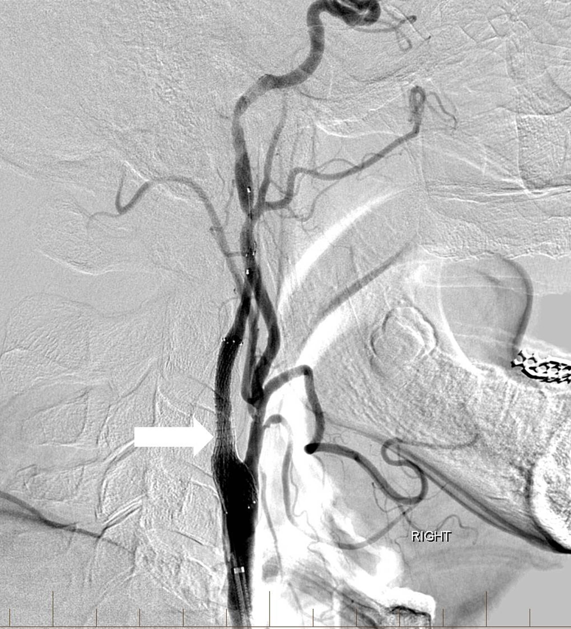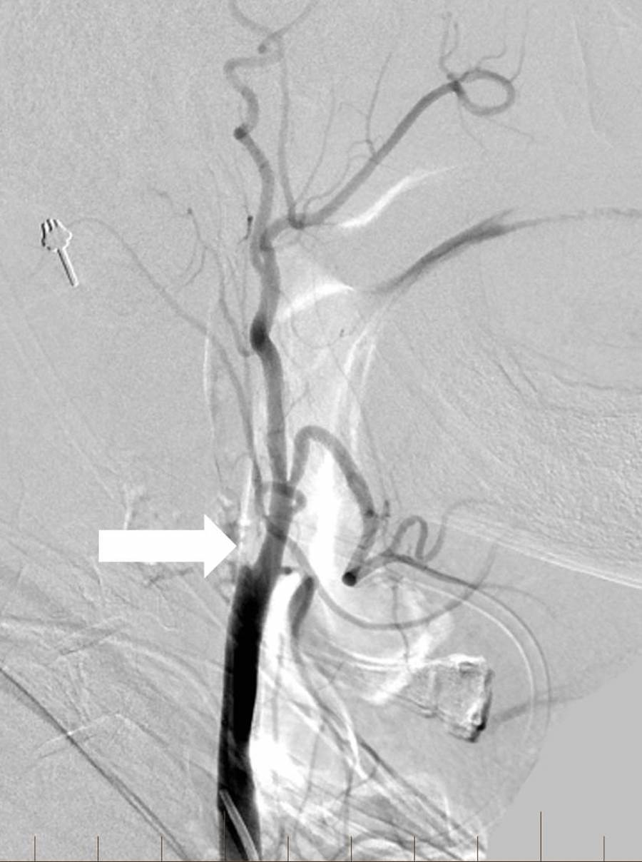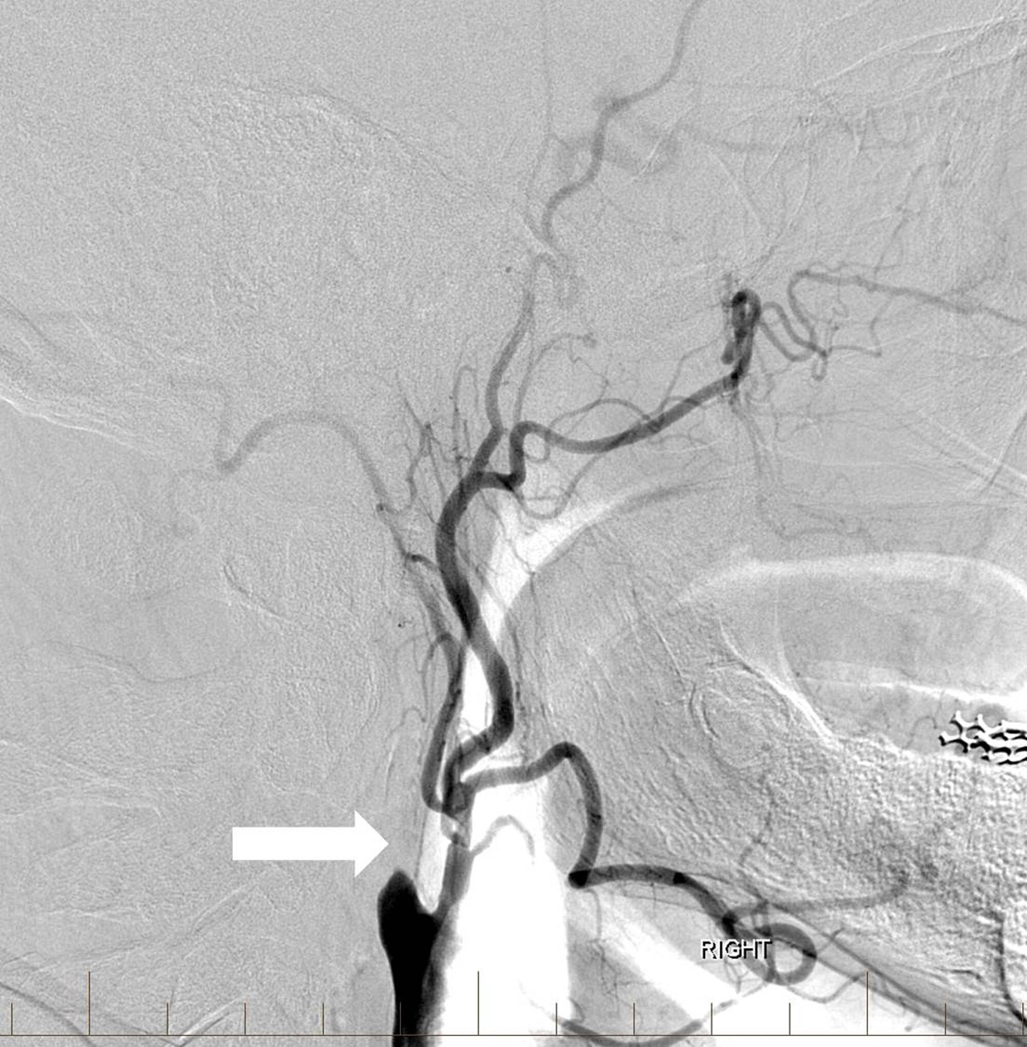 tPA was administered intravenously, and the patient was transferred to the interventional neuroradiology suite. Biplane digital subtraction angiography revealed a complete occlusion of the cervical right ICA at the vessel’s origin due to extensive atherosclerotic disease (Figure 6).