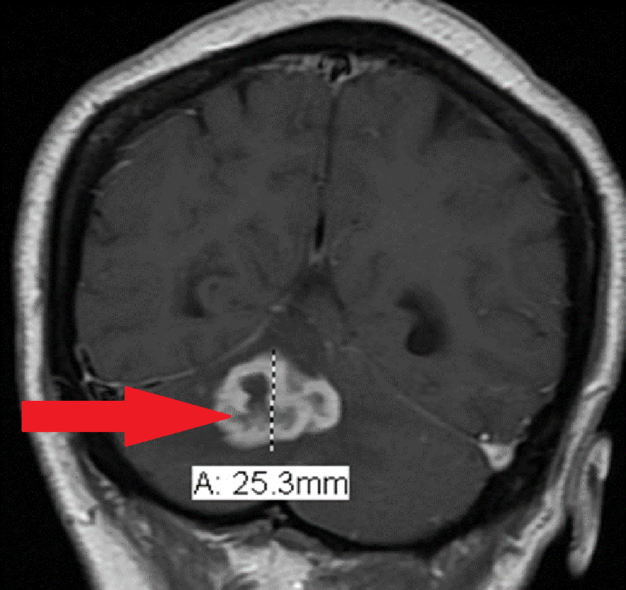 A 48-year-old African American female presented with a one-month history of headaches and nausea. Her only significant past medical history was diabetes. Her social history was negative for such risk factors as a high-risk profession in the healthcare field, recent incarceration, known contact with persons diagnosed with active tuberculosis or recent travel to areas in which tuberculosis is endemic. Her physical exam was unremarkable, and she had no focal neurological deficits. She was afebrile and hemodynamically stable. She presented to an outside facility where she had a computerized tomography (CT) scan of her head performed, which showed a posterior fossa mass with moderate hydrocephalus. This was followed by a magnetic resonance imaging (MRI) of the brain with and without contrast, which revealed a large right cerebellar ring-enhancing mass (Figures 1-2). The primary concern at that time was that this mass could possibly be a primary brain glioma like a high-grade astrocytoma or a medulloblastoma. The patient was transferred to another hospital for neurosurgical evaluation and excision of the mass. She underwent an exploratory posterior fossa craniectomy, cerebellar exploration and decompression, but no mass was identified at that time. Due to persistent headaches, she then had a repeat exploration of posterior fossa 15 days later, and identification and excision of the cerebellar mass occurred. Histopathology from the procedure revealed necrotizing granulomas (Figure 3), and stains specific for acid fast bacilli and fungus were both negative. Subsequently, the brain tissue grew Mycobacterium tuberculosis. The patient reported no prior knowledge of having tuberculosis, nor did she endorse exposure to patients with active tuberculosis. She previously had purified protein derivative (PPD) tests for employment, which had been negative. She was not immunocompromised and had recently been tested negative for human immunodeficiency virus (HIV) six months prior.