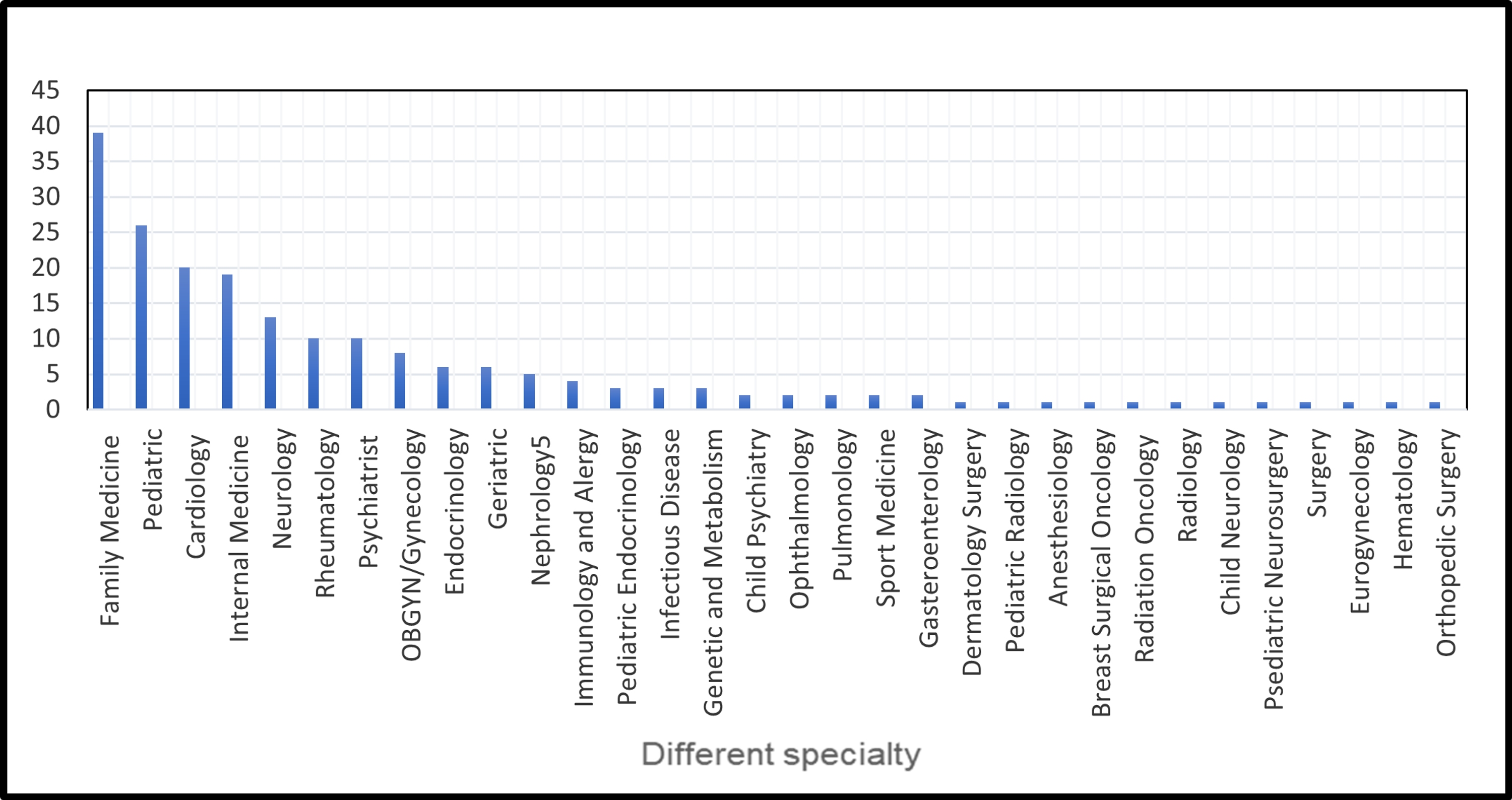 Primary care (including Family Medicine, Internal Medicine, Pediatrics) accounted for 42% of those surveyed. Other larger subsets of specialties represented included Cardiology (10%), Neurology (6.5%), and Psychiatry (5%).