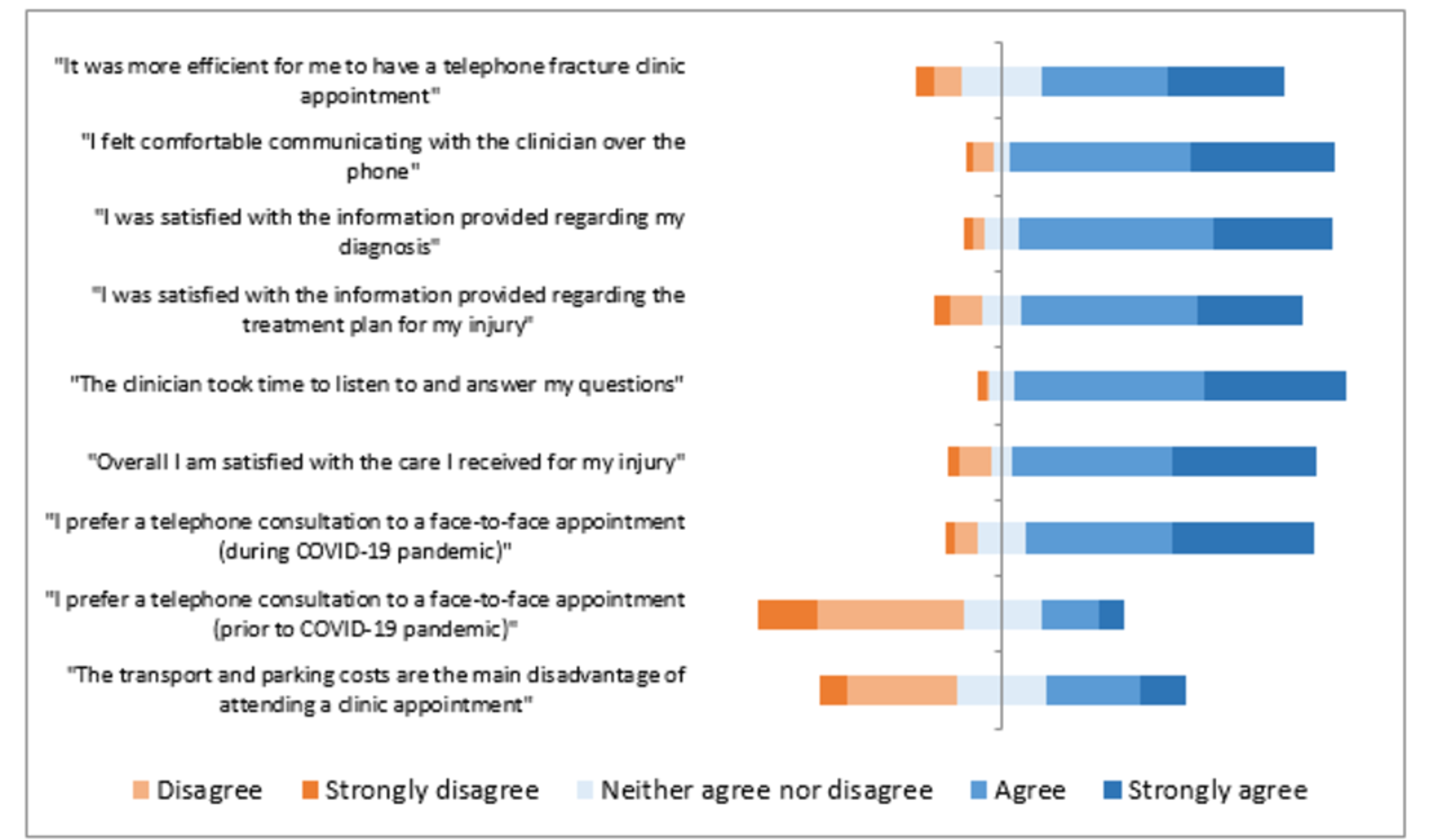 This was a retrospective study of 299 patients who had fracture clinic appointments delivered by telephone consultation between March 18, 2020, and April 25, 2020. Of these, 10% were for new injuries and 90% were follow-up appointments. All patients were aged 16 years or older (range=16-98). These patients were sent a postal satisfaction survey. All non-responders were sent one reminder survey. Anyone referred by the institutional emergency department (or surrounding minor injury units) or who had a follow-up appointment in the study period was included. There were no exclusions. Ethical approval was waived by the local committee. The Standards for Reporting Qualitative Research were applied [3].