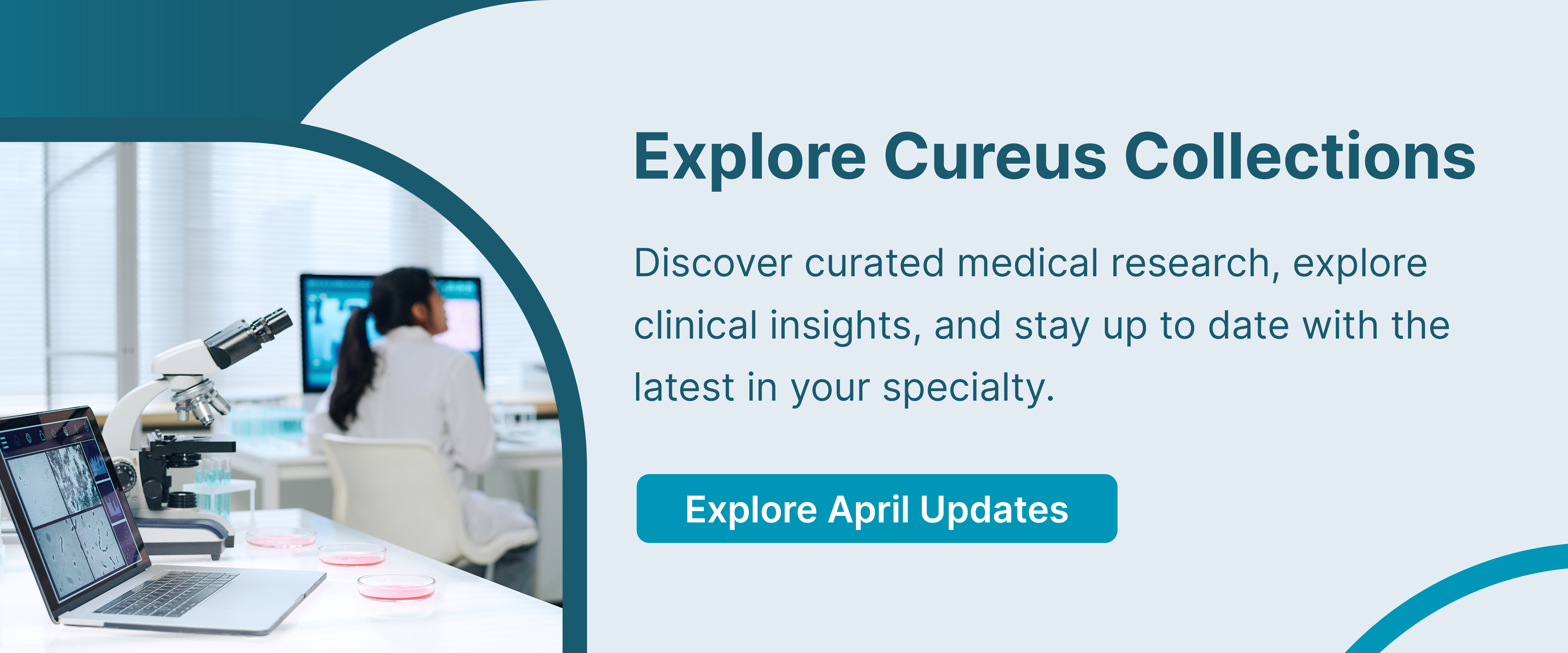 Curated to spotlight peer-reviewed research on specialized medical topics, Cureus Collections make it easier to explore, share, and contribute to focused areas of study. We group related articles to enhance visibility, foster collaboration, and advance knowledge within the medical community.