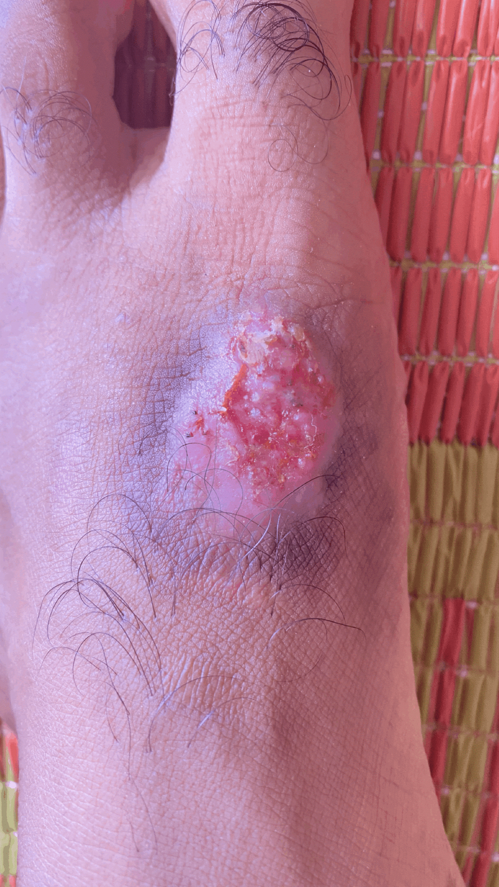 A 36-year-old healthy male presents with a 15-year history of a non-healing left foot ulcer that began after minor trauma. The lesion is erythematous with a violaceous rim, intermittently exudative, and unresponsive to antibiotics, antifungals, and steroids. He has no systemic symptoms. Biopsy shows tuberculoid granulomas with multinucleated giant cells, and Ziehl-Neelsen stain is positive for acid-fast bacilli. What’s your diagnosis?