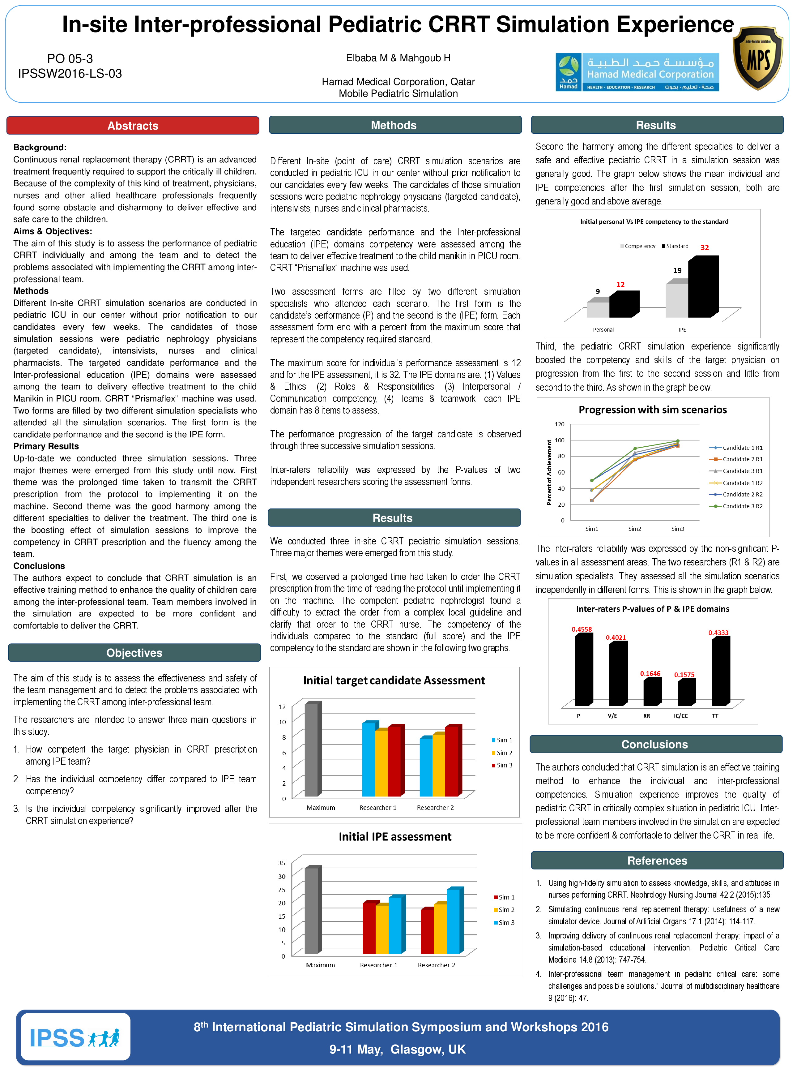 Different In-site CRRT simulation scenarios are conducted in pediatric ICU in our center without prior notification to our candidates every few weeks. The candidates of those simulation sessions were pediatric nephrology physicians (targeted candidate), intensivists, nurses and clinical pharmacists. The targeted candidate performance and the Inter-professional education (IPE) domains were assessed among the team to delivery effective treatment to the child Manikin in PICU room. CRRT “Prismaflex” machine was used. Two forms are filled by two different simulation specialists who attended all the simulation scenarios. The first form is the candidate performance and the second is the IPE form.