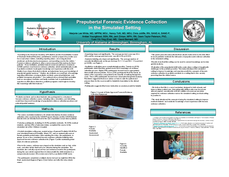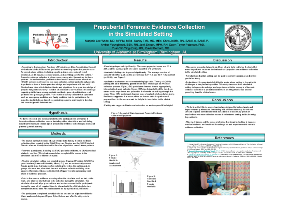 According the American Academy of Pediatrics, pediatricians must be prepared to provide care for sexual abuse victims, including reporting sexual abuse, assessing physical, emotional and behavioral consequences of the abuse, and providing care for the victims. Forensic evidence collection is often necessary as part of the workup. At our institution, pediatric-trained sexual assault nurse examiners (SANE) perform most forensic evidence collection, which unintentionally results in pediatric residents’ inadequate knowledge and experience with forensic evidence collection in children. In addition, studies have shown that chief residents and physicians have poor knowledge of prepubertal genital anatomy. Our hypothesis is that after participation in specifically designed didactic course of simulation, pediatric residents and medical students would have improved knowledge of prepubertal evidence collection practices and pubertal genital anatomy. In this study, there are 42 total participants including 22 (52%) pediatric residents, 18 (43%) medical students, and 2 (5%) of unknown resident v.s. student status. The method included a 20-minute introductory forensic evidence collection video created by the SANE Program Director and physician expert involved with pediatric sexual abuse. A hybrid simulation setting was created using a Gaumard Pediatric HAL® Five year (Gaumard Scientific, Miami, FL) simulator and an anatomically correct female genitalia partial trainer. Evidence is staged on the simulator such as hair, a bite mark and other debris that is required to be collected. In addition, the simulator talks to participants during the case expressing fear and embarrassment. Participants must interact with the child in a compassionate manner. All participants watch the video and then participate in groups of 1-2 on the simulated forensic evidence collection experience utilizing the state-approved forensic evidence collection kits. All sessions are led by a SANE nurse and a pediatric emergency medicine physician with expertise in sexual abuse. All participants complete a nine multiple-choice question and an eight fill-in the blank anatomical diagram test before and after the sixty-minute course. The average pre-test score was 62% +- 20% and the average post-test score was 86% +- 9% (p<0.001). Anatomic labeling also improved; the average number of correctly identified parts on the pre-test was 5.2 + 1.3 and 5.8 + 1.1 post-test (p=0.008). Qualitative evaluations were overwhelmingly positive. 26 (81%) participants stated that they gained much more knowledge on evidence collection process. 8 (25%) participants learned how to appropriately interact with abused patients. 7 (22%) participants liked the hands on nature of the experience and pointed to the benefits of walking through the exam. 3 (9%) participants learned more about pubertal genital anatomy. Participants suggested that more anatomy would be helpful. In conclusion, the improved post-test scores and participants’ evaluations showed that the simulation course improves knowledge of forensic collection process, pubertal genital anatomy and how to handle abused victims. Evaluation of the prepubertal child in the acute abuse setting is fraught with challenges to pediatricians. This study introduced the simulated setting to improve knowledge and experience with the concepts of forensic evidence collection to residents and medical students in a less anxiety provoking setting.