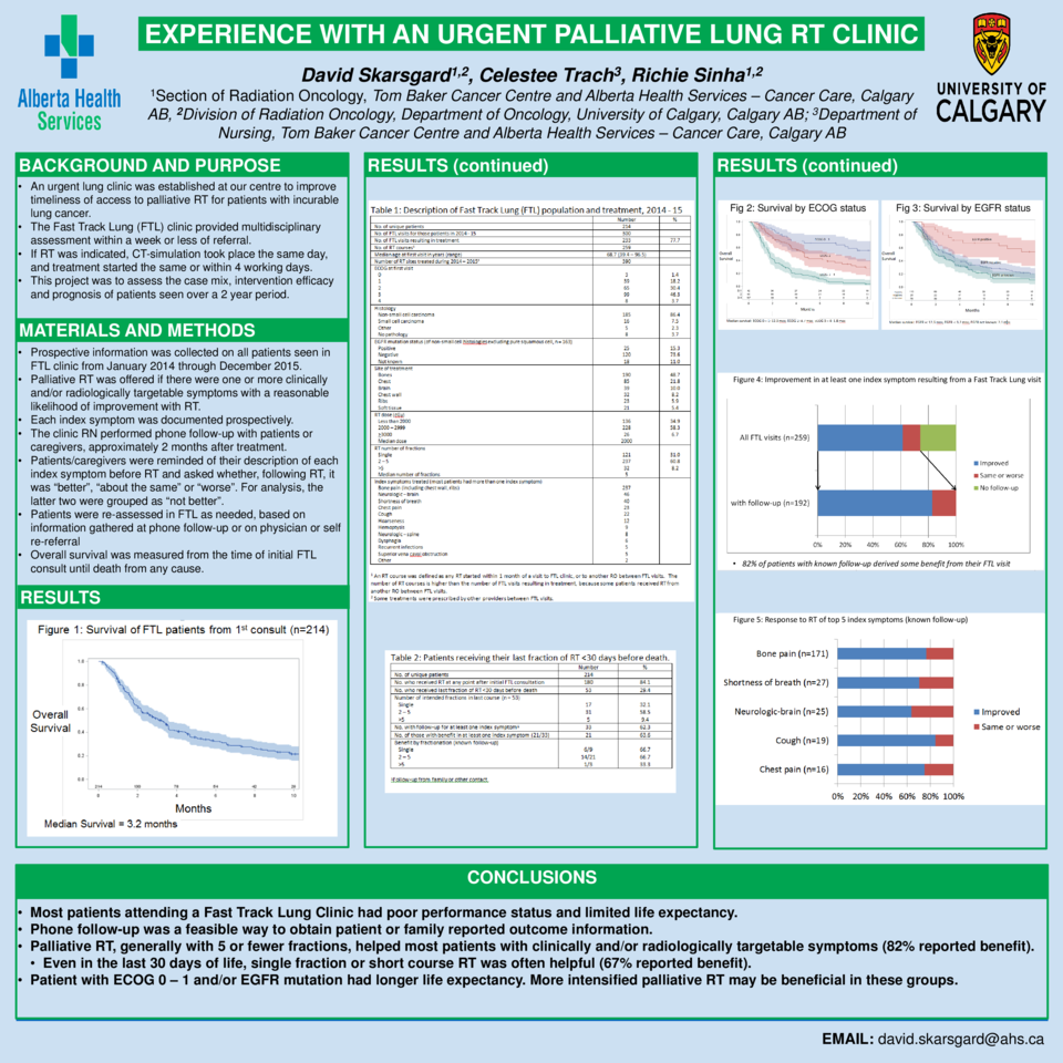 An urgent lung clinic was established to improve timeliness of access to palliative RT for patients with incurable lung cancer. The Fast Track Lung (FTL) clinic provides multidisciplinary assessment within a week of referral, followed by CT-simulation if appropriate, then treatment within 0 – 4 working days. This project was to assess the case mix, intervention efficacy and prognosis of patients seen over a 2 year period.