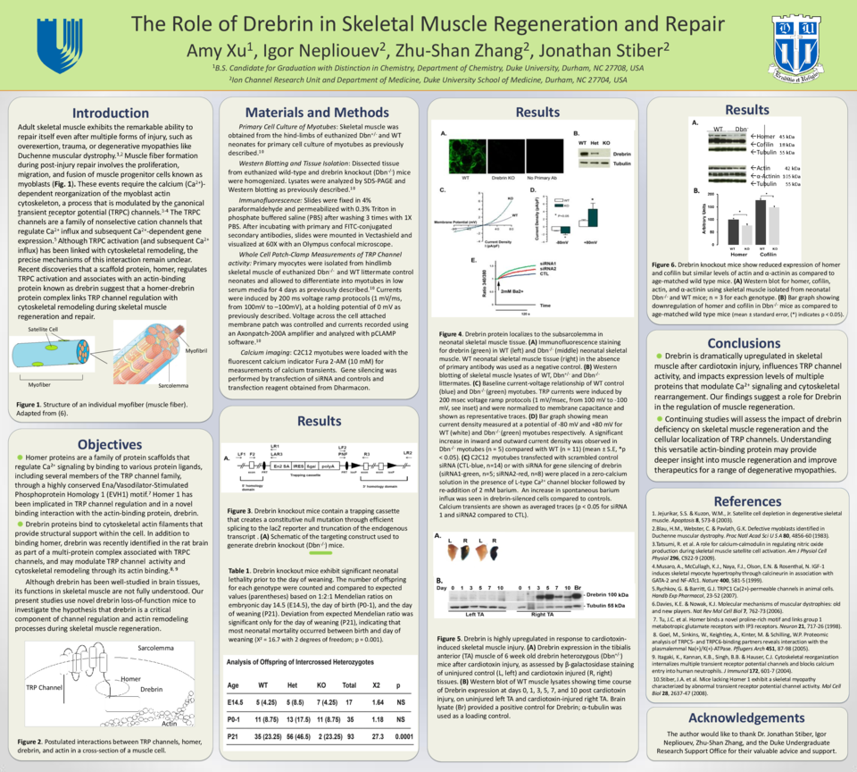 Muscle fiber formation during development and post-injury repair involves the proliferation, migration, and fusion of muscle stem cells known as myoblasts. These events necessitate the calcium (Ca2+)-dependent reorganization of the myoblast actin cytoskeleton, a process that is modulated by diverse proteins including the Transient Receptor Potential (TRP) channels, Homer scaffold proteins, and various actin-binding proteins. However, the detailed mechanisms linking TRP channel activation (and subsequent Ca2+ influx) with cytoskeletal remodeling remain unclear. Our recent findings indicate that the actin-binding protein drebrin is localized in the subsarcolemma of skeletal muscle tissue and is dramatically upregulated after cardiotoxin injury. Mice deficient in drebrin were viable, but showed significant lethality immediately after birth. As drebrin was also found to impact expression levels of multiple proteins involved in Ca2+ signaling and cytoskeletal rearrangement, we postulate that drebrin is a critical component of channel regulation and actin remodeling processes. Understanding drebrin’s various functions may provide deeper insight into muscle fiber development and repair, and improve current therapies for a range of degenerative myopathies.