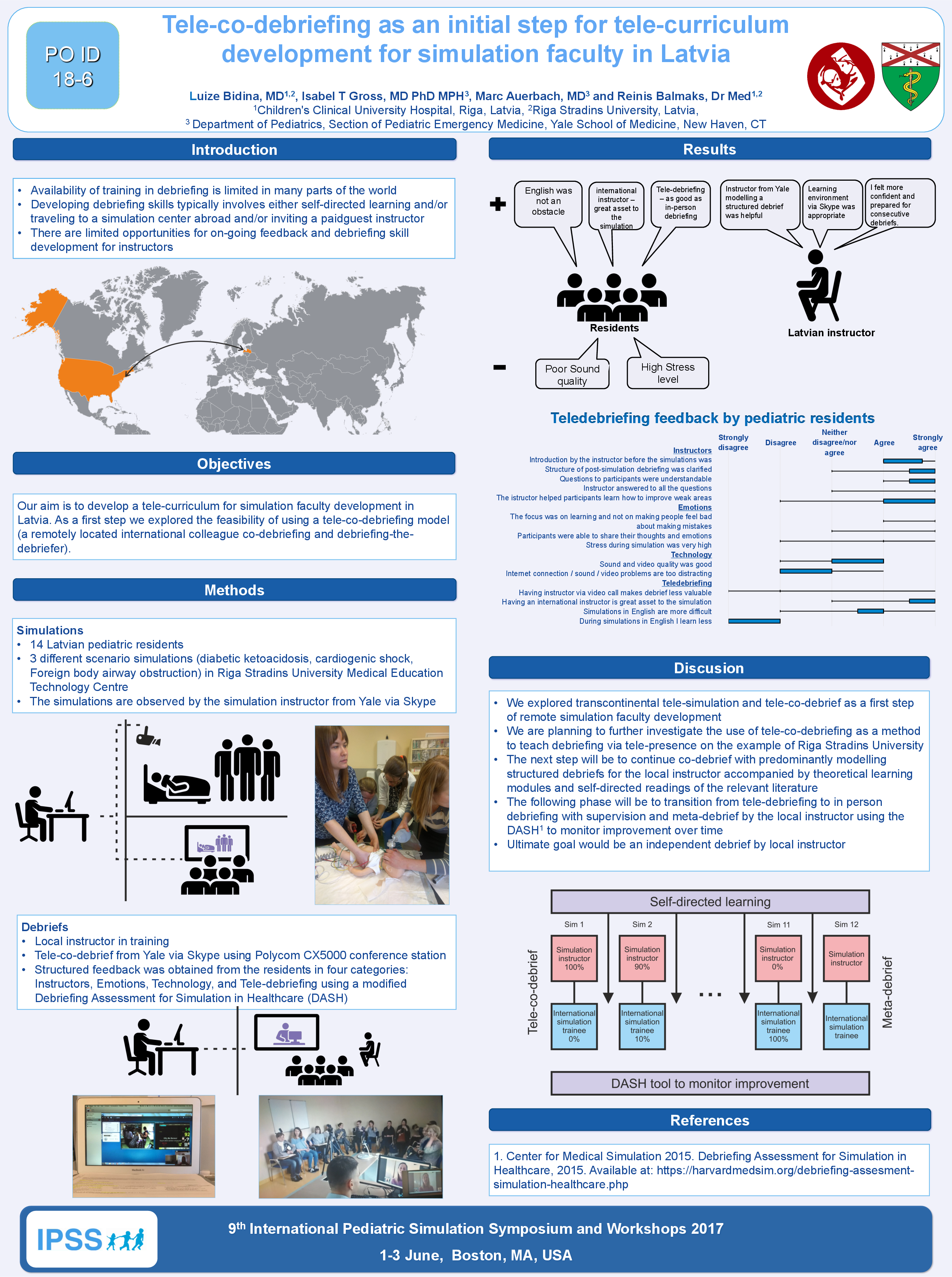 One simulation instructor in training from Riga Stradins University in Latvia co-debriefed with one simulation instructor from Yale School of Medicine. 14 Latvian pediatric residents participated in three different scenario simulations in Riga Stradins University Medical Education Technology Centre. The simulations were observed and the debrief was led by the simulation instructor from Yale via Skype modelling a debrief for the instructor in training from Riga. After the tele-debriefs a structured feedback was obtained from the residents in four categories: Instructors, Emotions, Technology, and Tele-debriefing.