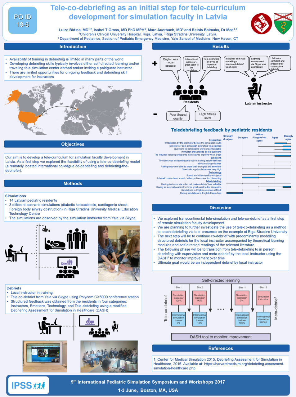 We explored transcontinental tele-simulation and tele-co-debrief as a first step of remote simulation faculty development. We are planning to further investigate the use of tele-co-debriefing as a method to teach debriefing via tele-presence on the example of Riga Stradins University. The next step will be to continue co-debrief with predominantly modelling structured debriefs for the international simulation trainee accompanied by theoretical learning modules and self-directed readings of the relevant literature. The next phase will be to transition from tele-debriefing to in person debriefing with supervision and meta-debrief by the international instructor using the DASH to monitor improvement over time. This project is an example of how technology can be used to facilitate simulation instructor training for areas of where no simulation courses are available, where resources are limited, or where faculty members are unable to travel.