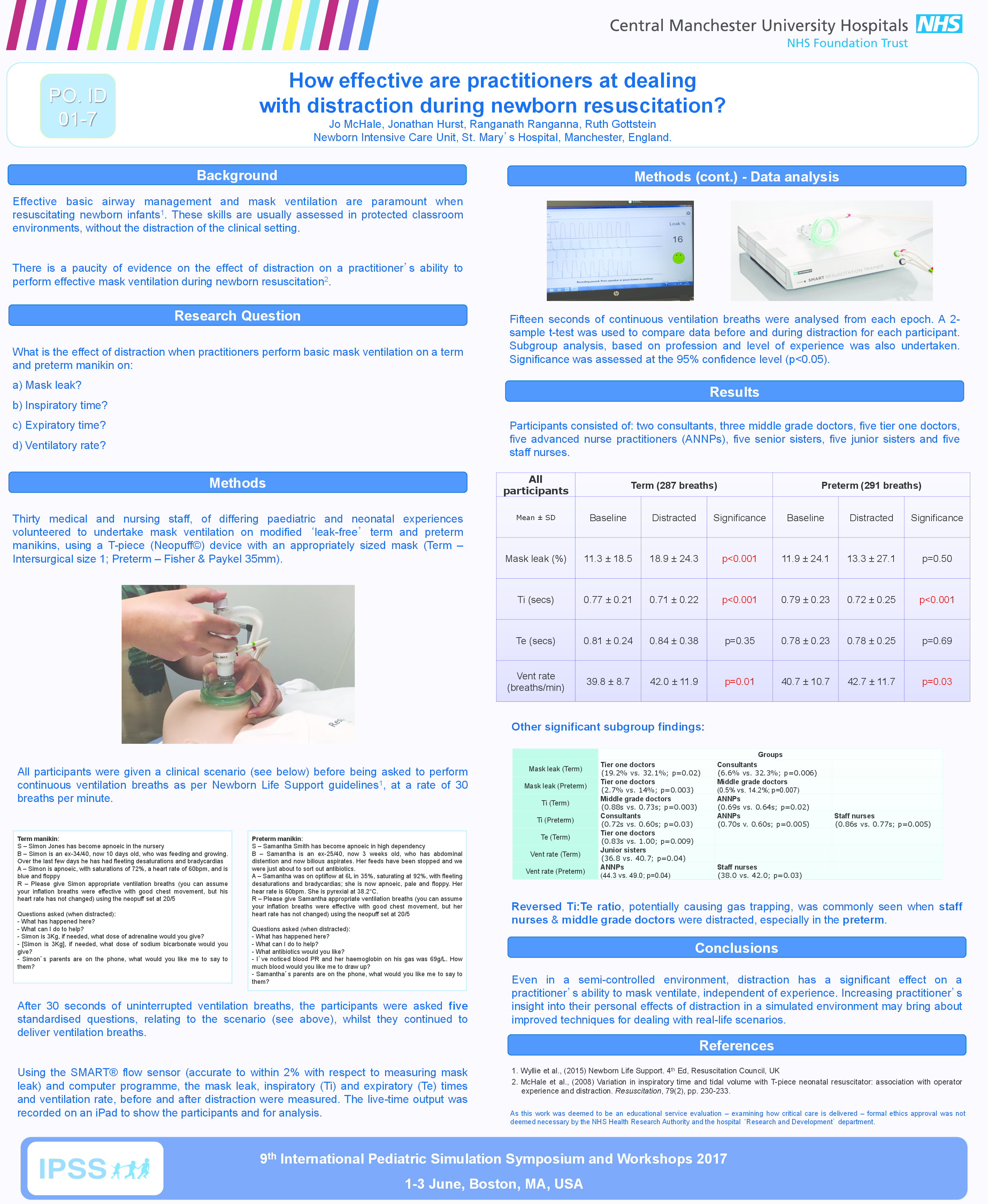 Background – Effective basic airway management and mask ventilation are paramount when resuscitating newborn infants1. These skills are usually assessed in protected classroom environments, without the distraction of the clinical setting. There is a paucity of evidence on the effect of distraction on a practitioner’s ability to perform effective mask ventilation during newborn resuscitation2.