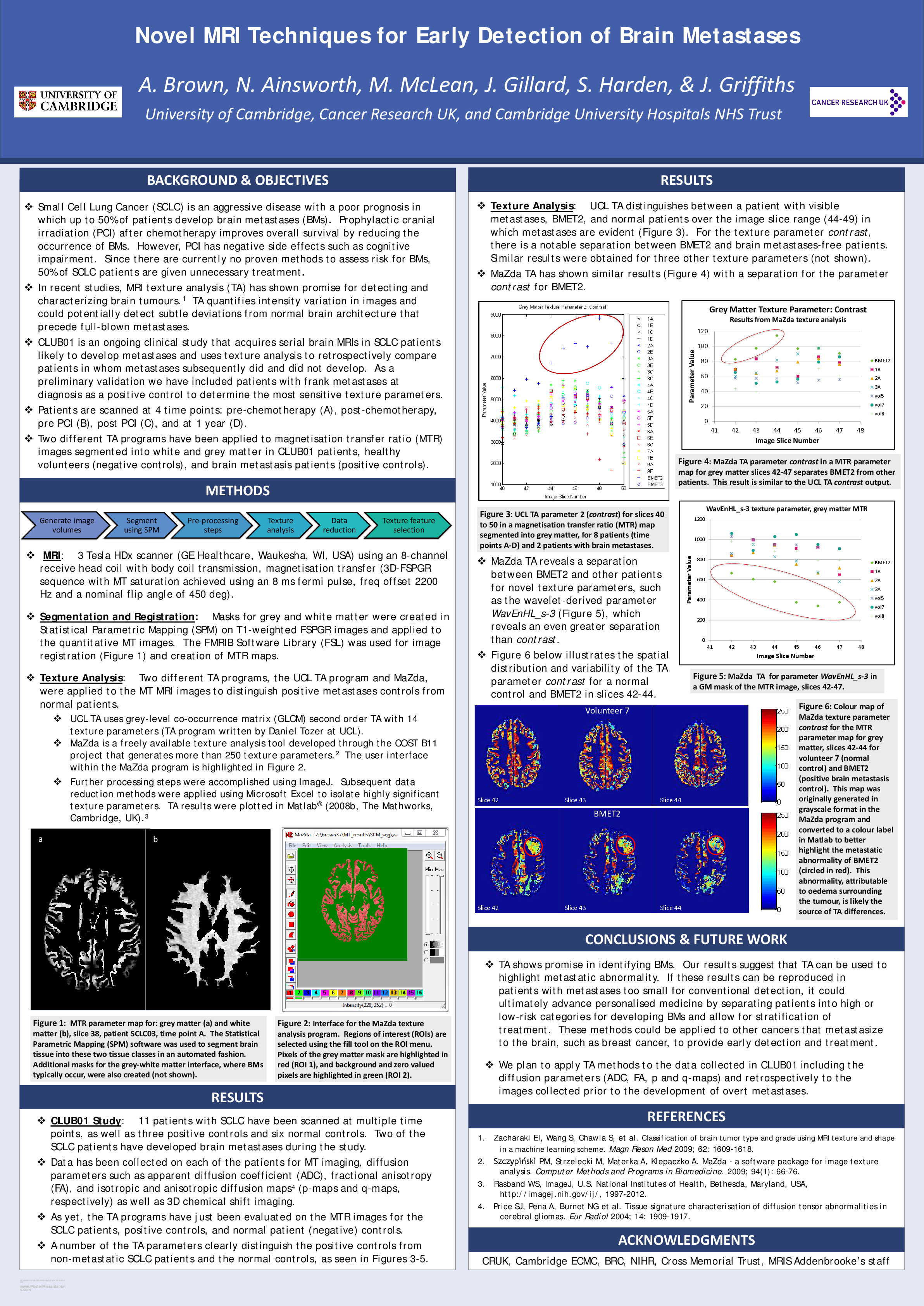 Background and Aims: Small Cell Lung Cancer (SCLC) is an aggressive disease with a poor prognosis in which up to 50% of patients develop brain metastases (BMETs). Prophylactic cranial irradiation (PCI) after chemotherapy improves overall survival by reducing the occurrence of BMETs. However, PCI has negative side effects such as cognitive impairment. Since there are currently no proven methods to assess risk for BMs, 50% of SCLC patients are given unnecessary treatment. In recent studies, MRI texture analysis (TA) has shown promise for detecting and characterizing brain tumours. TA quantifies intensity variation in images and could potentially detect subtle deviations from normal brain architecture that precede full-blown metastases.