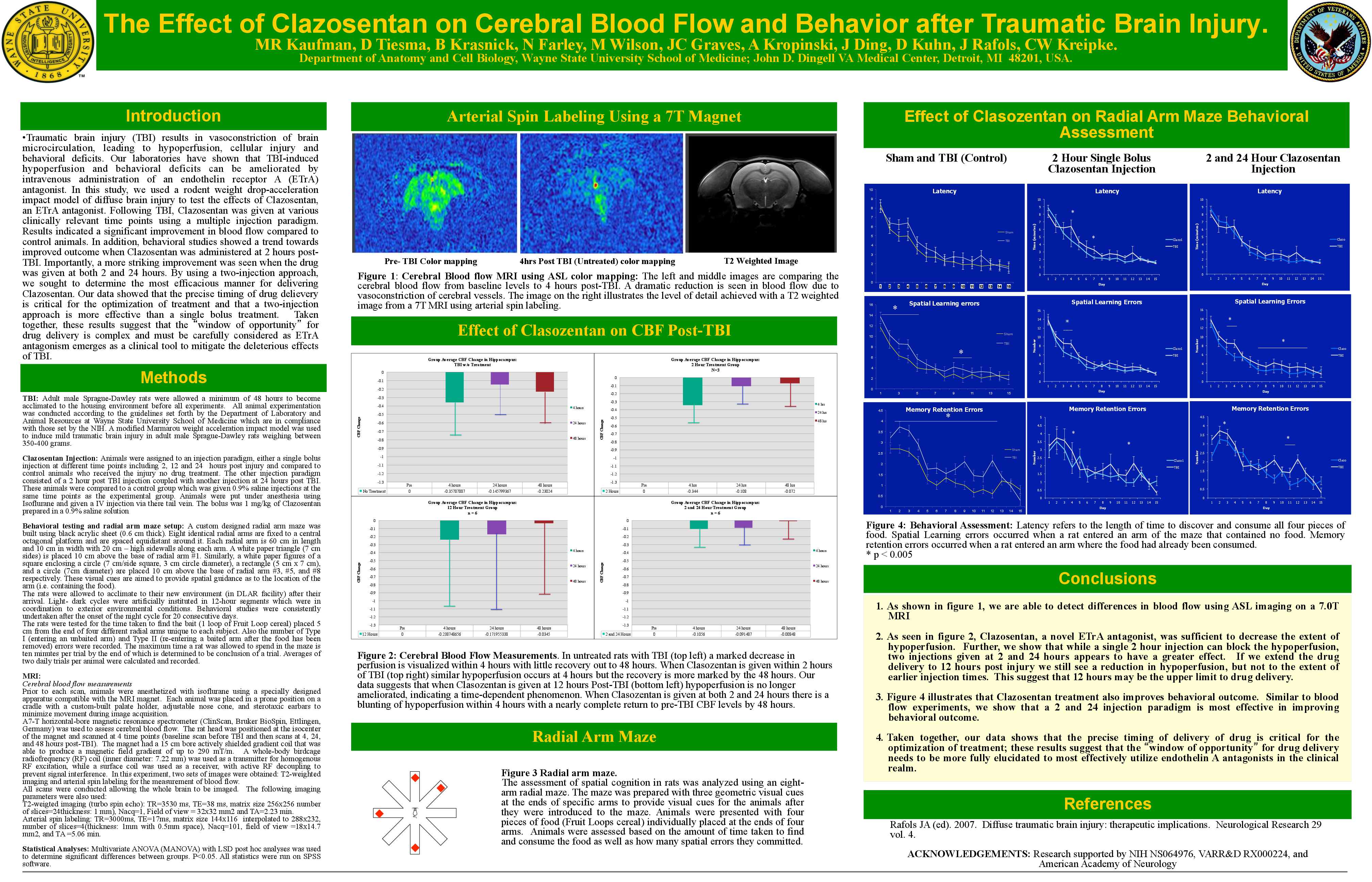 Traumatic brain injury results in multiple pathologies, including a significant reduction in cerebral blood flow. Our laboratory have shown that endothelin-1 plays a major role in the induction of hypoperfusion. Furthermore, we have demonstrated that the endothelin receptor A (ETrA) is upregulated as early as 4 hours post TBI and maintains upregulation up to 48 hours, thus temporally corresponding with the state of hypoperfusion. Therefore, using a rodent model of diffuse traumatic brain injury (acceleration impact in male, Sprague-Dawley rats, 400-450g), we sought to test the effects of IV administration of a selective ETrA antagonist, Clazosentan administered at various times post TBI on CBF (as measured up to 48 hours post injury using arterial spin labeling MRI, n=6 per group) and behavioral outcome (as measured up to 20 days post injury using a radial arm maze-spatial learning task, n=12-15 per group) following injury. We hypothesized that targeting ETrA could mitigate the deleterious effects of TBI. Our results indicate that when Clazosentan is administered at 30 minutes, 2 hours, or 4 hours after TBI there is a marked decrease in the extent of TBI-induced hypoperfusion. However, administration at 12 hours post TBI resulted in variable effects (i.e., some animals improved, some worsened, and some remained the same). The most effective paradigm was a dual-administration approach in which drug was given at 2 and 24 hours post TBI. Behavioral results recapitulated the blood flow results, showing that there was a trend towards improved behavioral outcome when Clazosentan was administered at 2 hours, however a significant improvement was seen when given at 2 and 24 hours. These results suggest that selective ETrA antagonism may be effective in mitigating the deleterious effects of TBI. Furthermore, it appears that our results help to define the “window of opportunity of drug delivery”.