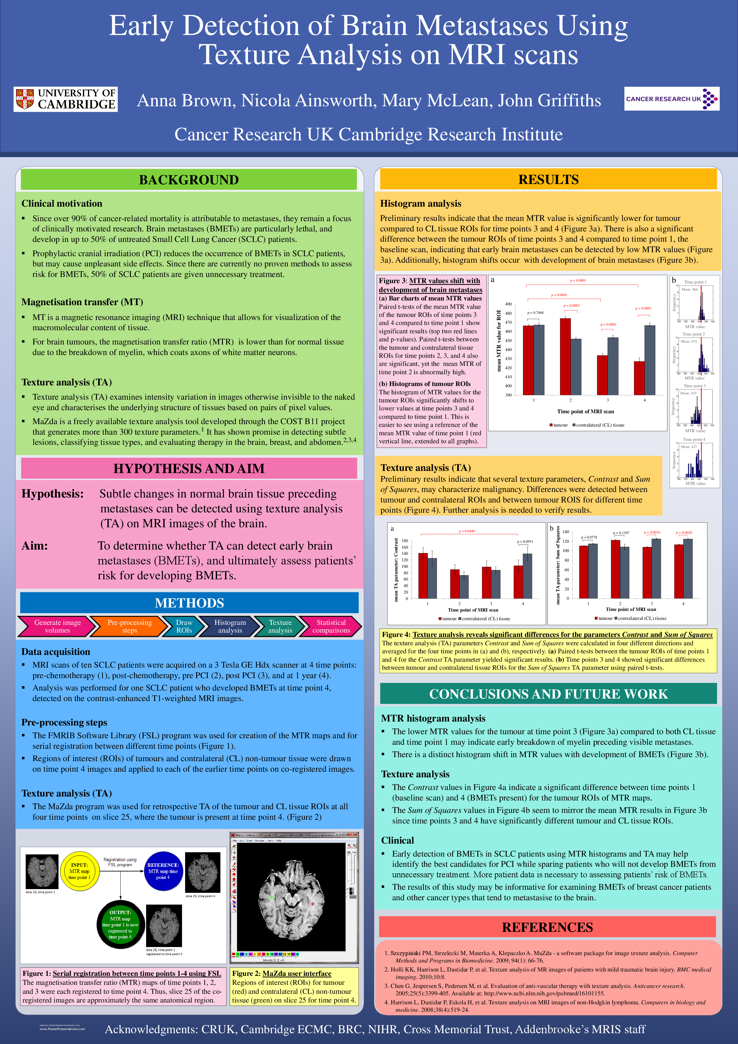 Analysis was performed on MRI scans (3 Tesla) acquired from ten SCLC patients. Patients were scanned at four time points, from pre-treatment to follow-up at one year. Two SCLC patients developed BMETs, and the MaZda TA program was used for retrospective analysis on those patients with freehand and standardized ROIs of the tumours and contralateral tissue. Preliminary results indicate that histogram shifts occur during the normal to neoplastic transition, and that differences in the distribution of pixel intensities for earlier time points can be detected with retrospective TA.