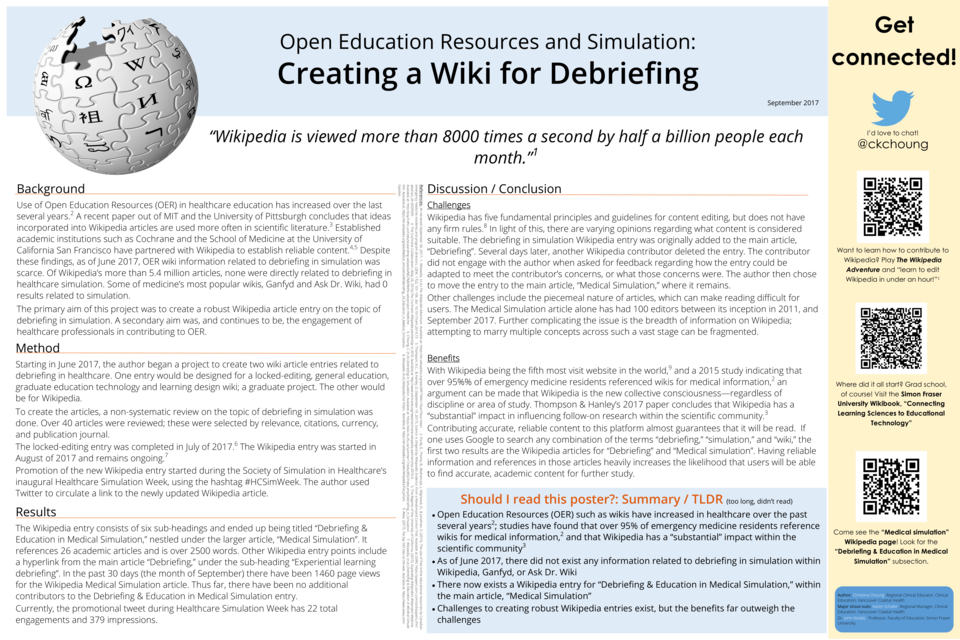 Background: Use of Open Education Resources (OER) in healthcare education have increased over the last several years. Despite an explosion in Wiki content, information related to debriefing in simulation remains scarce. Within Wikipedia, currently no articles related to debriefing in healthcare simulation exist. There is mention of “Experiential Learning in Debriefing”; the entry has no references and contains 148 words.