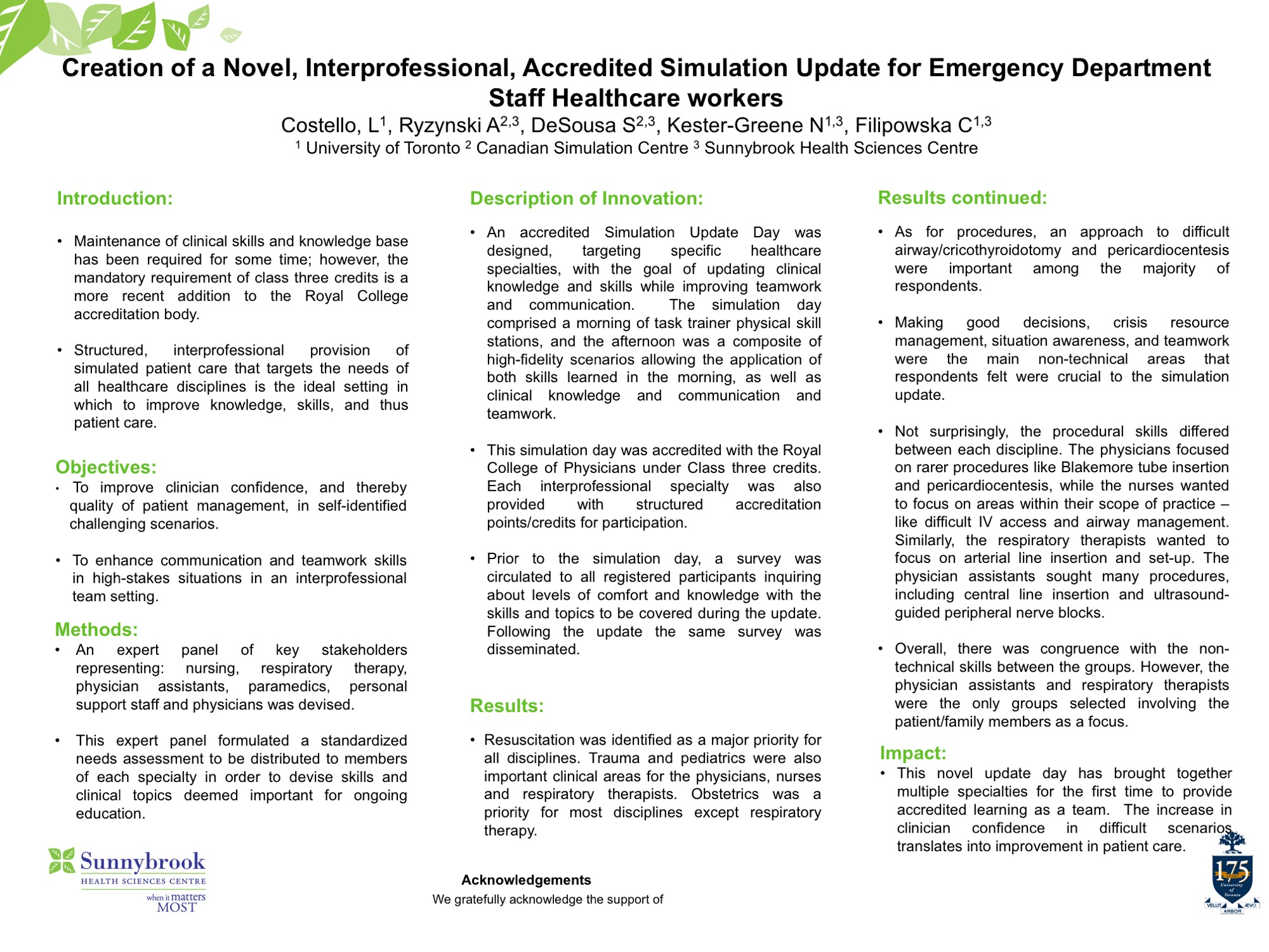 Background: Maintenance of clinical skills and knowledge base has been required for some time; however, the mandatory requirement of class three credits is a more recent addition to the Royal College accreditation body. Structured, interprofessional provision of simulated patient care that targets the needs of all healthcare disciplines is the ideal setting in which to improve knowledge, skills, and thus patient care.