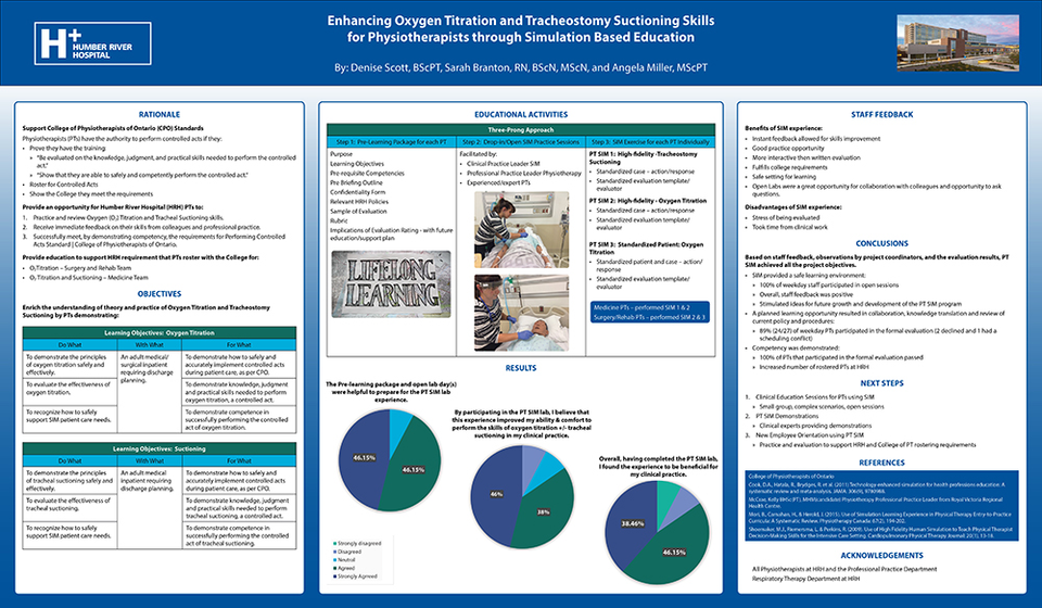Objective: To enrich staff’s understanding of the theory/practical application of controlled acts which Humber River Hospital physiotherapists are required to perform during patient care. Each physiotherapist, was expected to: 1) To demonstrate how to safely/accurately implement a controlled act; 2) To demonstrate the knowledge, judgment and practical skills needed to perform controlled acts; and 3) To demonstrate competence in successfully performing the identified controlled act.