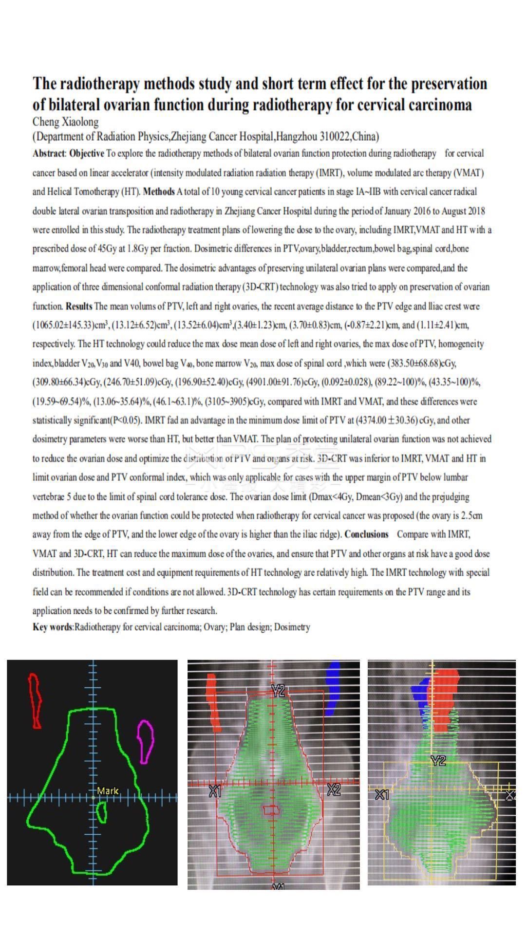 respectively. The HT technology could reduce the max dose mean dose of left and right ovaries, the max dose of PTV, homogeneity index,bladder V20,V30 and V40, bowel bag V40, bone marrow V20, max dose of spinal cord ,which were (383.50±68.68)cGy, (309.80±66.34)cGy, (246.70±51.09)cGy, (196.90±52.40)cGy, (4901.00±91.76)cGy, (0.092±0.028), (89.22~100)%, (43.35~100)%, (19.59~69.54)%, (13.06~35.64)%, (46.1~63.1)%, (3105~3905)cGy, compared with IMRT and VMAT, and these differences were statistically significant(P<0.05). IMRT fad an advantage in the minimum dose limit of PTV at (4374.00±30.36) cGy, and other dosimetry parameters were worse than HT, but better than VMAT. The plan of protecting unilateral ovarian function was not achieved to reduce the ovarian dose and optimize the distribution of PTV and organs at risk. 3D-CRT was inferior to IMRT, VMAT and HT in limit ovarian dose and PTV conformal index, which was only applicable for cases with the upper margin of PTV below lumbar vertebrae 5 due to the limit of spinal cord tolerance dose. The ovarian dose limit (Dmax<4Gy, Dmean<3Gy) and the prejudging method of whether the ovarian function could be protected when radiotherapy for cervical cancer was proposed (the ovary is 2.5cm away from the edge of PTV, and the lower edge of the ovary is higher than the iliac ridge). Conclusions Compare with IMRT, VMAT and 3D-CRT, HT can reduce the maximum dose of the ovaries, and ensure that PTV and other organs at risk have a good dose distribution. The treatment cost and equipment requirements of HT technology are relatively high. The IMRT technology with special field can be recommended if conditions are not allowed. 3D-CRT technology has certain requirements on the PTV range and its application needs to be confirmed by further research.
