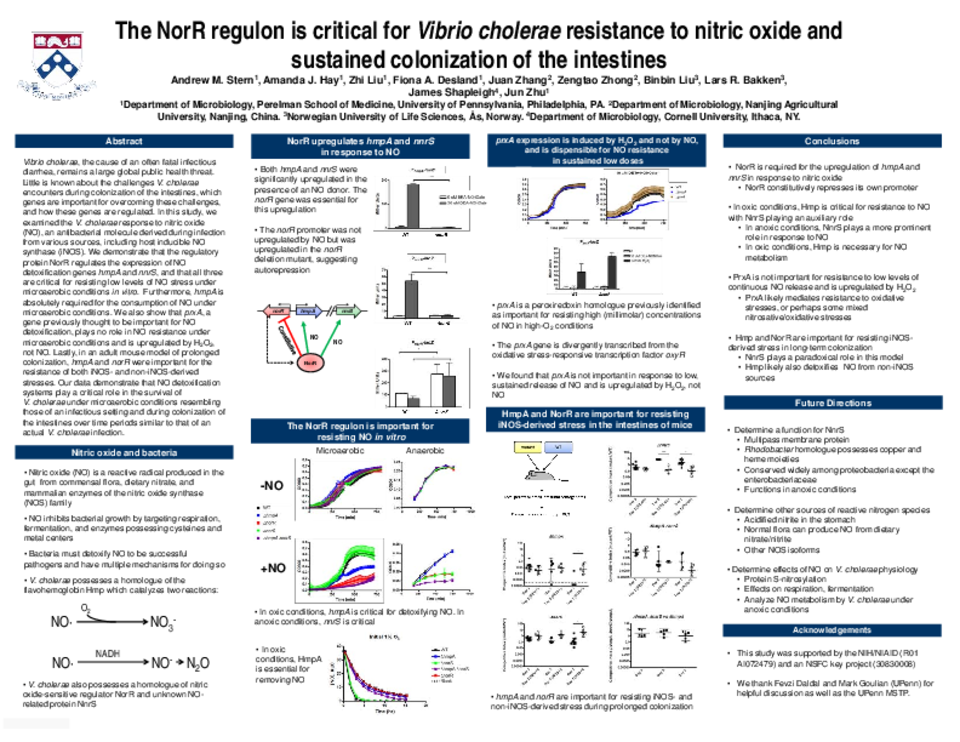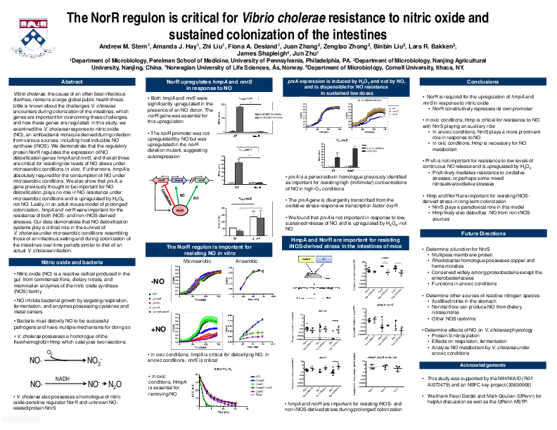 Vibrio cholerae, the cause of an often fatal infectious diarrhea, remains a large global public health threat. Little is known about the challenges V. cholerae encounters during colonization of the intestines, which genes are important for overcoming these challenges, and how these genes are regulated. In this study, we examined the V. cholerae response to nitric oxide (NO), an antibacterial molecule derived during infection from various sources, including host inducible NO synthase (iNOS). We demonstrate that the regulatory protein NorR regulates the expression of NO detoxification genes hmpA and nnrS, and that all three are critical for resisting low levels of NO stress under microaerobic conditions in vitro. Furthermore, hmpA is absolutely required for the consumption of NO under microaerobic conditions. We also show that prxA, a gene previously thought to be important for NO detoxification, plays no role in NO resistance under microaerobic conditions and is upregulated by H2O2, not NO. Lastly, in an adult mouse model of prolonged colonization, hmpA and norR were important for the resistance of both iNOS- and non-iNOS-derived stresses. Our data demonstrate that NO detoxification systems play a critical role in the survival of V. cholerae under microaerobic conditions resembling those of an infectious setting and during colonization of the intestines over time periods similar to that of an actual V. cholerae infection.