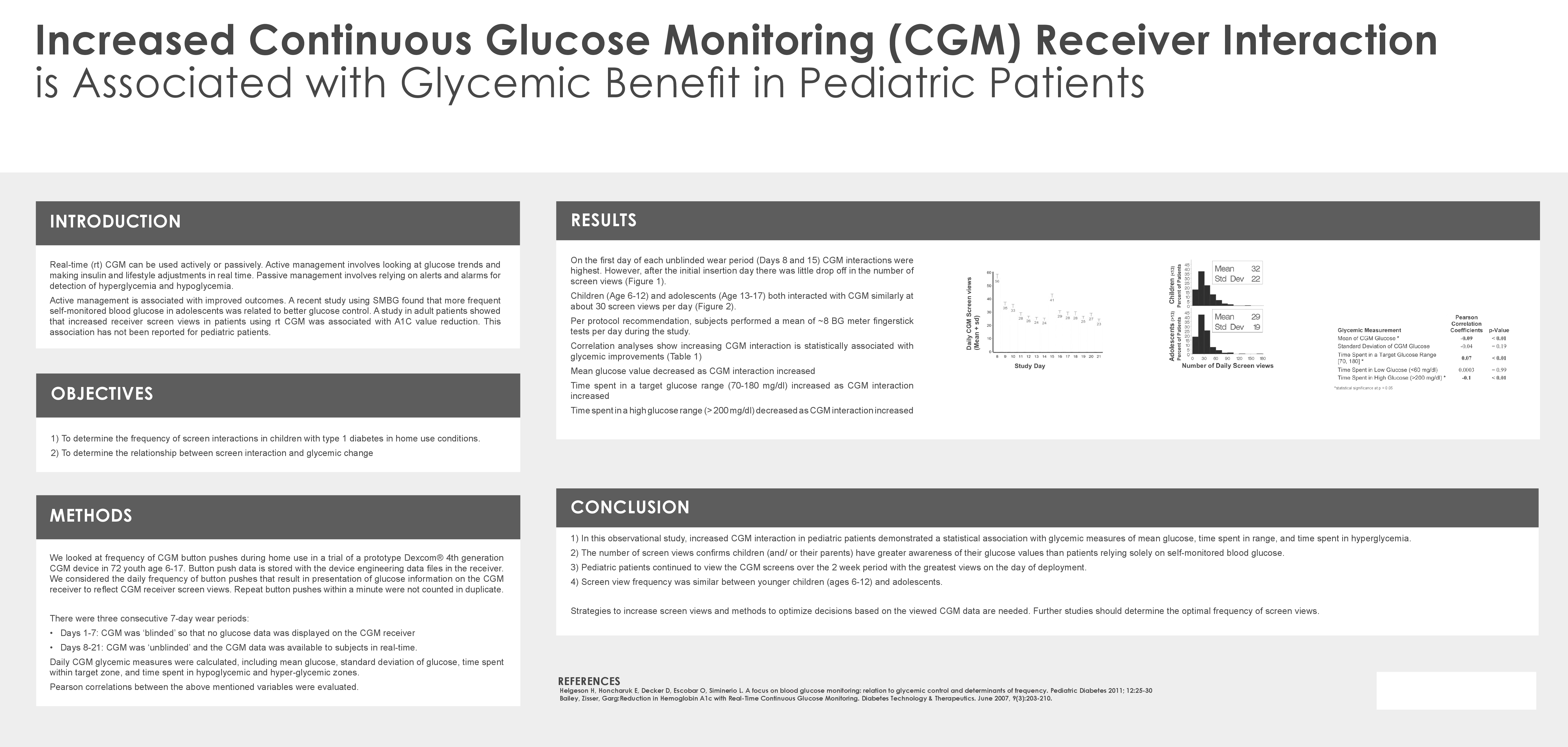 Correlation analyses show increasing CGM receiver screen view frequency is associated with a statistically significant improvement in the time spent within a target glucose range (70-180 mg/dL), time spent high (> 200 mg/dL), and also in mean of CGM glucose (all p < 0.05). Neither time spent low (< 60 mg/dL) nor standard deviation of CGM glucose was found to have a significant association. Similar to adult patients, an increased frequency of receiver interaction in pediatric subjects using rt-CGM demonstrated association with glycemic improvement.