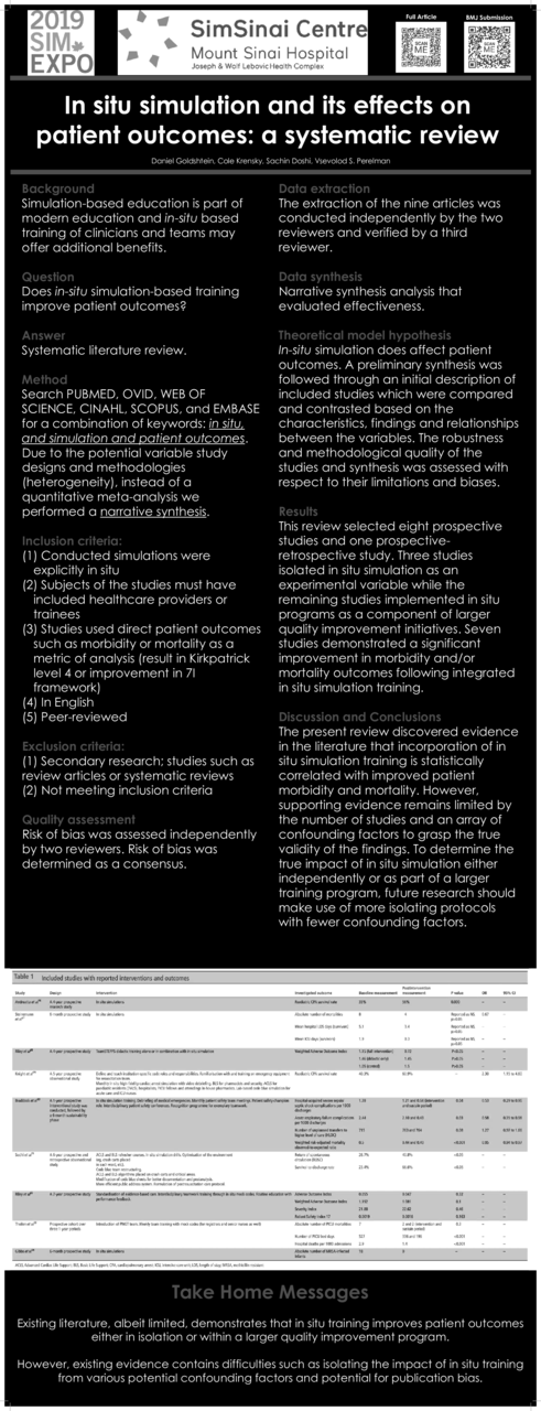 This review selected eight prospective studies and one prospectiveretrospective study. Three studies isolated in situ simulation as an experimental variable while the remaining studies implemented in situ programs as a component of larger quality improvement initiatives. Seven studies demonstrated a significant improvement in morbidity and/or mortality outcomes following integrated in situ simulation training.