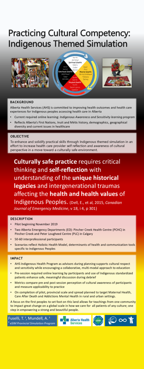 The modality of simulation as a teaching approach enables application of learned knowledge to enhance and solidify practical skills of communication in an indigenous frame, increasing sensitivity in the provision of health care and building cultural competence. The eSIM Indigenous Integration Simulation Package includes a guideline for use, allowing faculty to deliver a rich simulation experience to diverse, interprofessional teams and areas across Alberta, with careful direction and informed guidance.