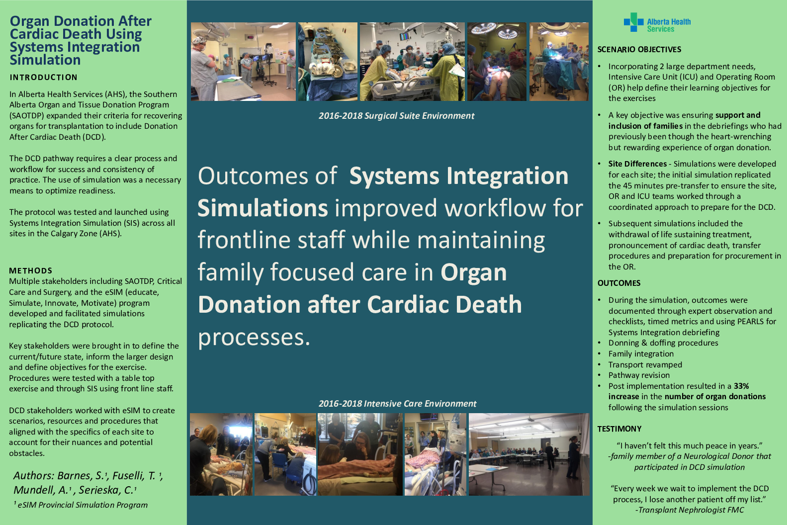Multiple stakeholders including SAOTDP, Critical Care and Surgery, and the eSIM program developed and facilitated simulations replicating the DCD protocol. The stakeholders tested the procedures through a table top exercise, then through system simulations. Simulations were developed for each site; the initial simulation replicated the 45 minutes pre-transfer to ensure the site, OR and ICU teams worked through a coordinated approach to prepare for the DCD. Subsequent simulations included the withdrawal of life sustaining treatment, pronouncement of cardiac death, transfer procedures and preparation for procurement in the OR.