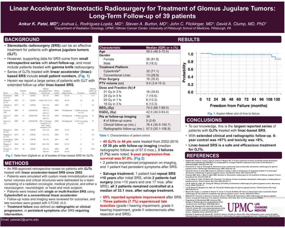 Methods: An IRB-approved retrospective review was conducted on patients with GJTs treated with linear accelerator-based SRS since 2002. Patients were simulated with custom mask immobilization and tumor volumes and critical structures were delineated by a team consisting of a radiation oncologist, medical physicist, and either a neurosurgeon, neurotologist, or head and neck surgeon. Patients were treated with single or multi-fraction SRS using Cyberknife® or a conventional linear accelerator. Follow-up notes and imaging were reviewed for outcomes, and late toxicities were graded with CTCAE v5.0. Treatment failure was defined as radiographic or clinical progression, or persistent symptoms after SRS requiring intervention.