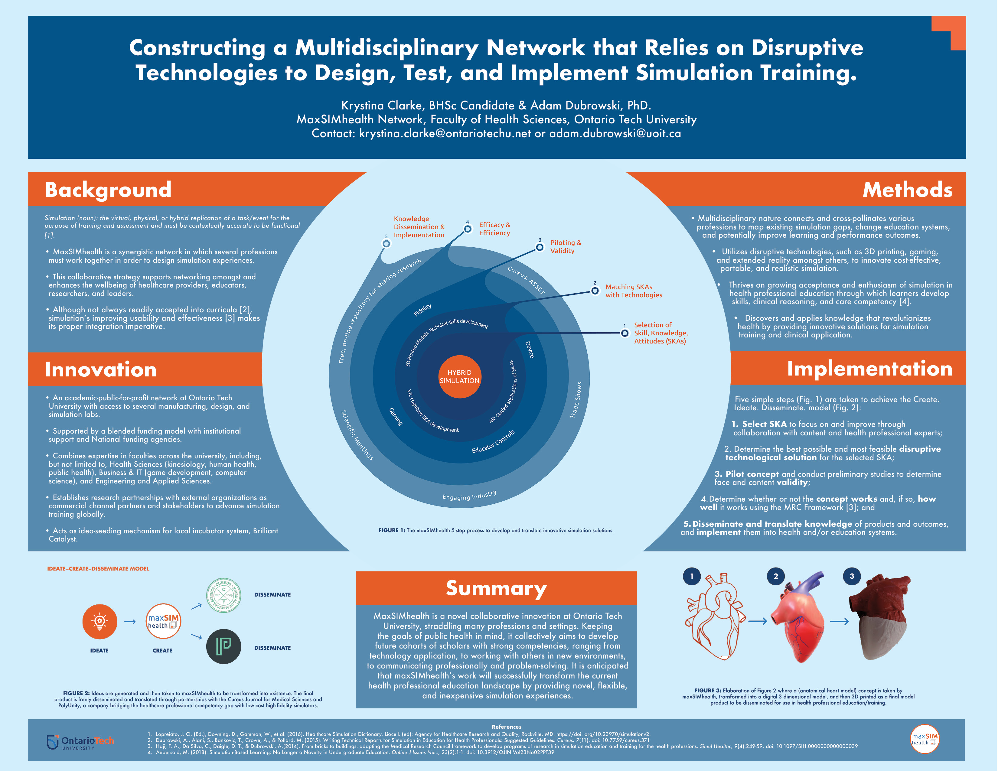 Methods: MaxSIMhealth utilizes disruptive technologies (3D printing, gaming, extended reality) as innovative solutions that deliver cost-effective, portable, and realistic simulation, which is currently lacking. Our work spans a broad spectrum of scholarship from mapping existing gaps, to changing education systems, to improving learning and performance outcomes. To ensure timely and meaningful knowledge translation, we have established an institutional channel within the Cureus Journal for Medical Sciences where our work is freely disseminated as peer-reviewed, PubMed-indexed publications.