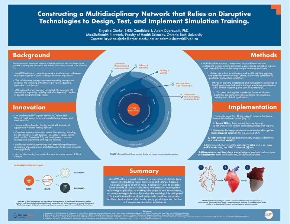 Innovation: MaxSIMhealth is a multidisciplinary network of manufacturing, design, and simulation labs at Ontario Tech University combining expertise in Health Sciences, Business and IT, Engineering, and more while building community partnerships to advance simulation training. Its vision is to advance knowledge discovery and application that revolutionizes health by offering innovative solutions for simulation training and clinical application. It discovers existing simulation gaps, provides innovative solutions that can change systems, and could improve healthcare outcomes.