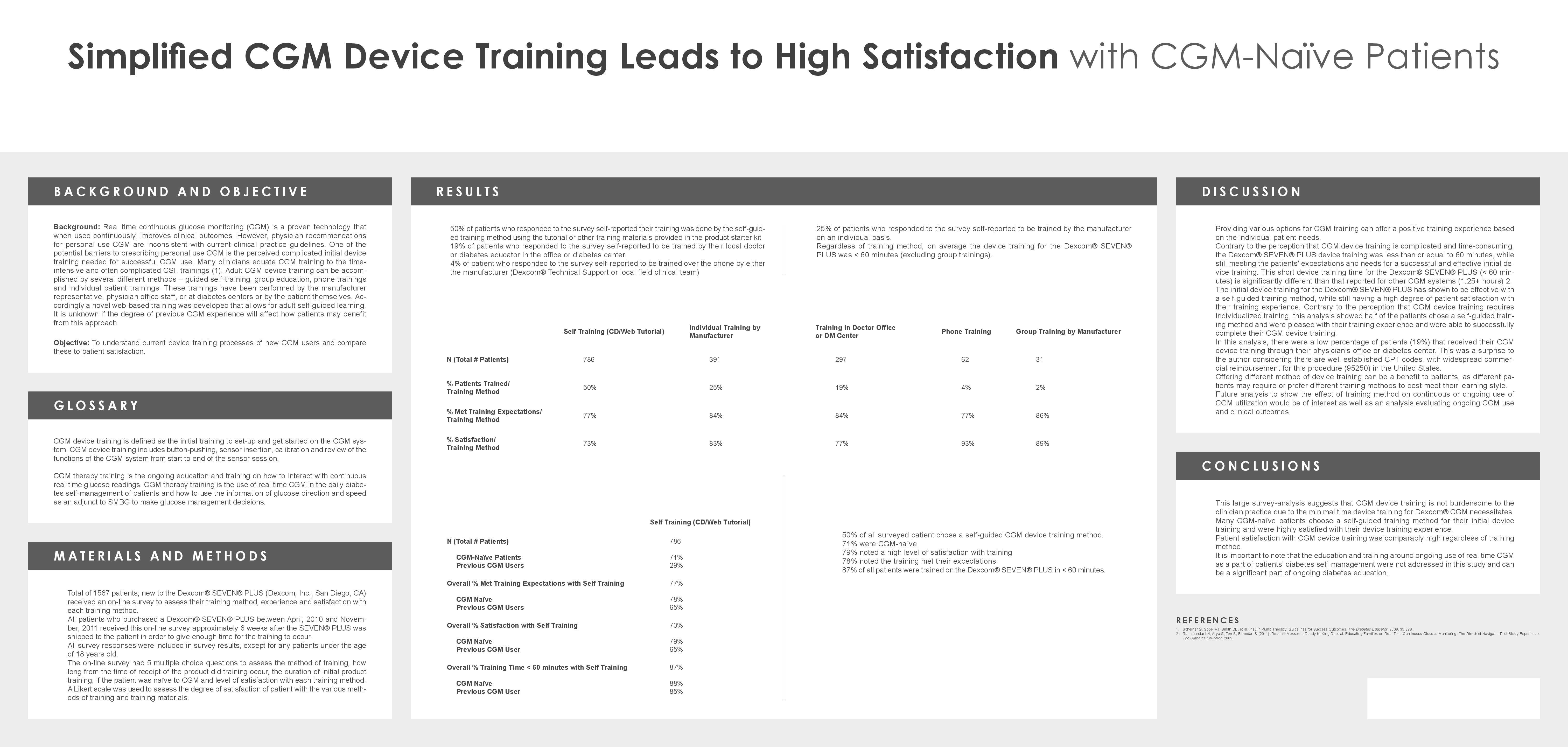 The data confirms many adult patients can successfully initiate Dexcom CGM through a self-guided training program with a high degree of satisfaction. The majority of CGM naïve patients chose a self-guided training method, but reported a high level of satisfaction with their device training experience. The level of satisfaction with the self-guided training method was higher in the CGM-naïve patients when compared to past-CGM users. This surprising outcome leads to the conclusion that a web-based CGM device tutorial can be an effective and convenient method of device training for CGM-naïve patients.