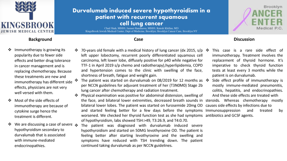 Discussion: This case is a rare side effect of immunotherapy. Treatment involves the replacement of thyroid hormone. It’s imperative to check thyroid function tests at least every 3 months while the patient is on durvalumab. Side effect profile of immunotherapy is mostly immune-mediated pneumonitis, colitis, hepatitis, and endocrinopathies. And these side effects are treated with steroids. Whereas chemotherapy mostly causes side effects by infections due to immunosuppression and treated by antibiotics and GCSF agents.