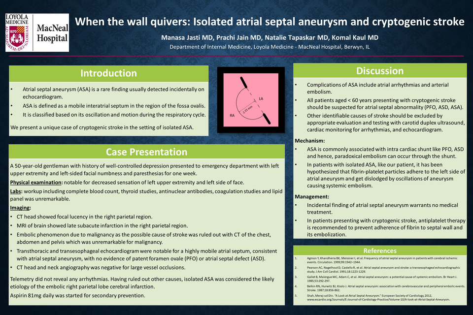Case Description: A 50-year-old gentleman with history of well-controlled depression presented to emergency department with left upper extremity and left-sided facial numbness and paresthesias for one week. Physical examination was notable for decreased sensation of left-sided face and left upper extremity. Workup including complete blood count, thyroid studies, antinuclear antibodies, coagulation studies and lipid panel was unremarkable. CT head showed focal lucency in the right parietal region. MRI of brain showed late subacute infarction in the right parietal region. Transthoracic and transesophageal echocardiogram were notable for a highly mobile atrial septum, consistent with atrial septal aneurysm, with no evidence of intra-cardiac shunt. CT head and neck angiography was negative for large vessel occlusions. Telemetry did not reveal any arrhythmias. Having ruled out other causes, isolated ASA was considered the likely etiology of the embolic stroke. Aspirin 81mg daily was started for secondary prevention.