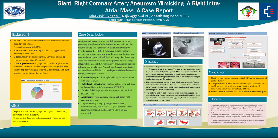 We present an interesting case of 66 years old female encountered to establish primary care with presenting complaints of right lower leg cellulitis. Echocardiography was ordered considering the previous history of MRSA-positive cellulitis and decreased exercise tolerance. A preliminary diagnosis of Right atrium cystic tumor was made. Further radiological evaluations confirmed a giant right coronary artery aneurysm—the potential near-miss timely managed by exclusion surgery.