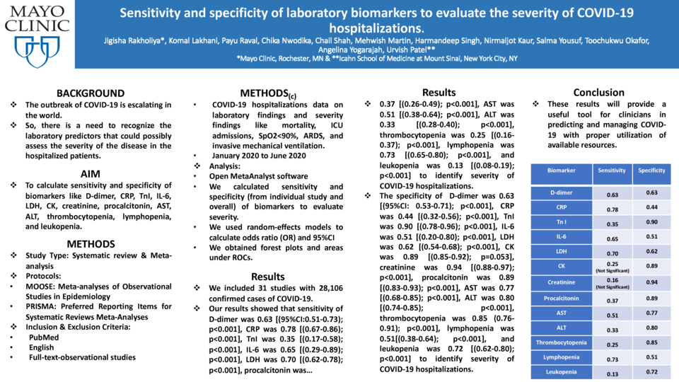 Methods: By using Meta-analyses of Observational Studies in Epidemiology (MOOSE) and Preferred Reporting Items for Systematic Reviews and Meta-Analyses (PRISMA) protocols, we searched PubMed to identify English full-text-observational studies that had data on laboratory findings and severity findings like mortality, ICU admissions, SpO2<90%, ARDS, and invasive mechanical ventilation in COVID-19 hospitalizations between January 2020 to June 2020. Open MetaAnalyst software was used to calculate sensitivity and specificity (from individual study and overall) of biomarkers to evaluate severity. We used random-effects models to calculate odds ratio (OR) and 95%CI and to obtain forest plots and areas under ROCs.