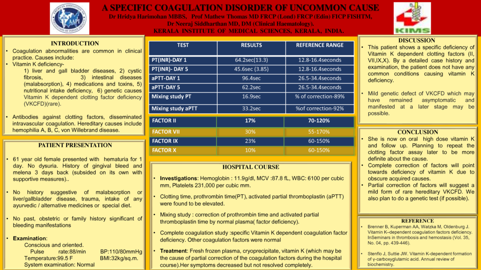 CASE DESCRIPTION :61-year-old female with hypertension presented with haematuria-1 day. No dysuria. History of epistaxis and melena 2 and 3 days back. No history suggestive of malabsorption or liver/gallbladder disease. No history of any trauma, intake of herbal/alternative medicines or special diet. No past, obstetric and family history significant of bleeding.