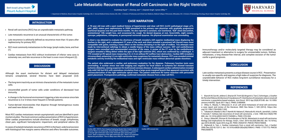 A 78-year-old man with a history of clear cell RCC (AJCC pathological stage: pT3, pNX, pMX) status post nephrectomy in 2008 presented to his primary care physician with progressive dyspnea, intermittent non-exertional chest discomfort, dry cough, and unintentional 13lb weight loss over the past 3 months. A chest x-ray revealed tracheal deviation, and a subsequent CT scan of the neck and chest revealed a large mass in the upper mediastinum and a filling defect within the apex of the right ventricle (RV). TTE revealed an RV apical mass measuring 3.0 x 2.5 cm without RV outflow tract obstruction. Cardiac MRI revealed a circumscribed, enhancing 3.5 cm right ventricular mass suspicious for metastatic disease. A nuclear stress test with imaging was negative for focal infarct or ischemia but showed transient ischemic dilatation, raising suspicion for multivessel coronary disease. A subsequent cardiac catheterization revealed only mild CAD but findings consistent with neovascularization of the right ventricular mass. PET scan revealed minimal metabolic activity involving the mediastinal mass and right ventricular mass without abnormal uptake elsewhere. The patient underwent RV tumor resection with pericardial patch placement. Postoperative pathology confirmed metastatic disease from a clear cell RCC.