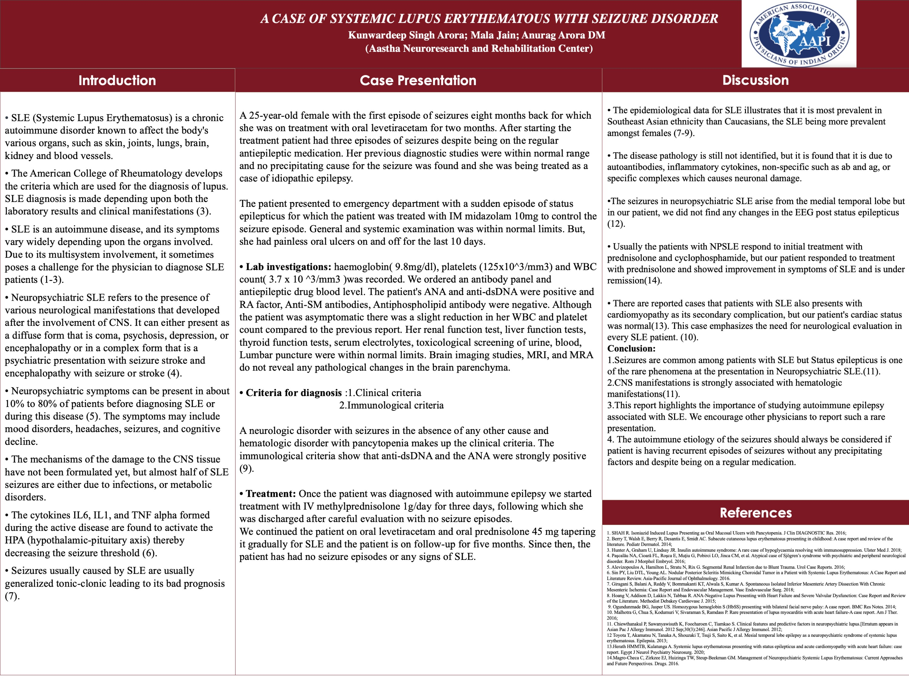Conclusion: The case report highlights the importance of studying autoimmune epilepsy associated with SLE. The autoimmune etiology of the seizures should always be considered if the patient is having recurrent episodes of seizures without any precipitating factors and despite being on regular medication. Moreover, this study shows that early diagnosis may be proved helpful in decreasing mortality and morbidity thereby letting effective treatment.