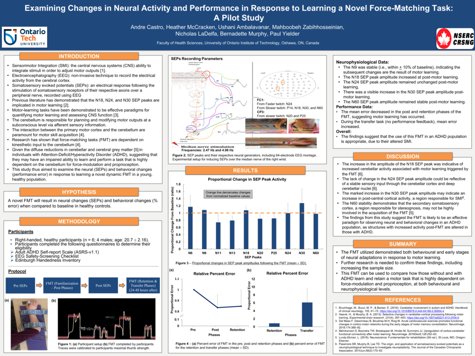 Research has shown that the learning of a novel motor task leads to neuroplastic changes in the central nervous system that are impacted by changes in sensorimotor integration. Individuals with Attention Deficit Hyperactive Disorder (ADHD) have marked reductions in cerebellar and cerebral grey matter volumes, which may suggest impaired sensorimotor integration. The ability to accurately match and grade force is heavily reliant on cerebellar function, suggesting that force matching accuracy could be impacted in those with ADHD. The purpose of this pilot study was to determine whether neural and behavioural changes can be seen following the learning of a novel force-matching task in healthy controls, with the goal of applying this paradigm to an ADHD population in future research.