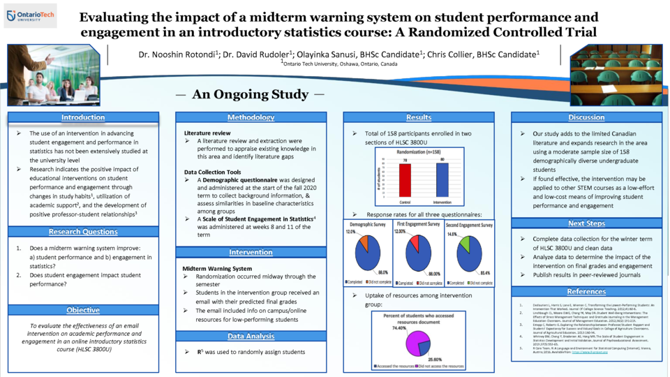 The use of a midterm warning intervention to improve student engagement and performance in statistics has not been evaluated at the university level. The current project is an RCT designed to evaluate the effectiveness of an email intervention on academic performance and engagement in an online introductory statistics course (HLSC 3800U).