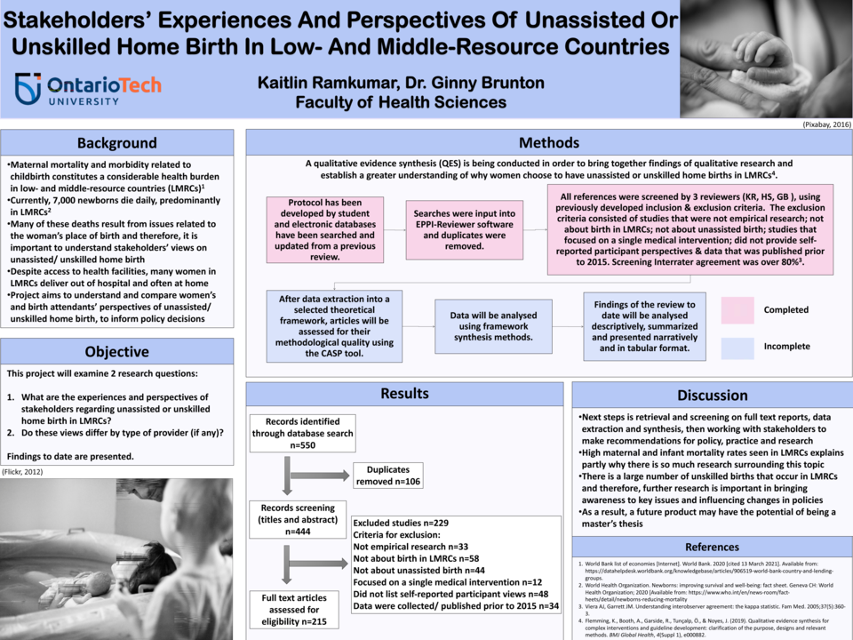 Results: The review has progressed to eligibility screening. Searching identified 515 references. Eligibility screening inter-rater agreement was over 80%2. Screening on title and abstracts resulted in 300 references that were excluded: 71 were duplicates; 33 were not empirical research; 58 were not about birth in LMRCs; 44 were not about unassisted birth; 12 focused on a single medical intervention during home birth; 48 did not provide participant perspectives; and 34 were published prior to 2015. The remaining 215 articles will be retrieved for full text screening.