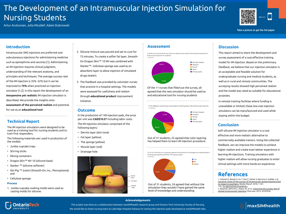 Intramuscular (IM) injections are preferred over subcutaneous injections for administering medicine such as epinephrine and vaccines as the muscle tissue contains an increased vascular supply that provides ideal absorption of the drug being administered. However, administering an IM injection requires clinical judgment when choosing the injection site, understanding the relevant anatomy and physiology as well as the principles and techniques for administering an IM injection. Therefore, it is essential to learn and perform IM injections using injection simulators to practice the skill before administering to a real patient. Current IM injection simulators either favor realism at the expense of standardization or are expensive but do not provide a realistic experience. Therefore, it is imperative to develop an inexpensive but realistic intramuscular injection simulator that can be used to train nursing students so that they can be prepared for when they enter the clinical setting.