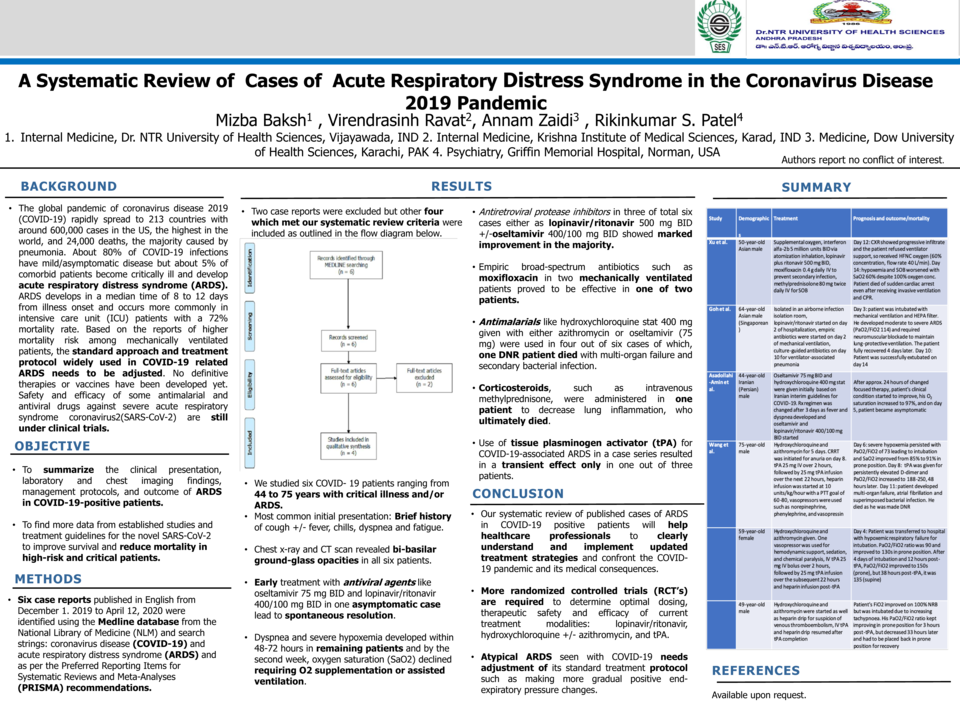 METHODS: Six case reports published in English from December 1. 2019 to April 12, 2020 were identified using the Medline database from the National Library of Medicine (NLM) and search strings: coronavirus disease (COVID-19) and acute respiratory distress syndrome (ARDS) and as per the Preferred Reporting Items for Systematic Reviews and Meta-Analyses (PRISMA) recommendations. Two case reports were excluded but other four which met our systematic review criteria were included as outlined in the flow diagram below.