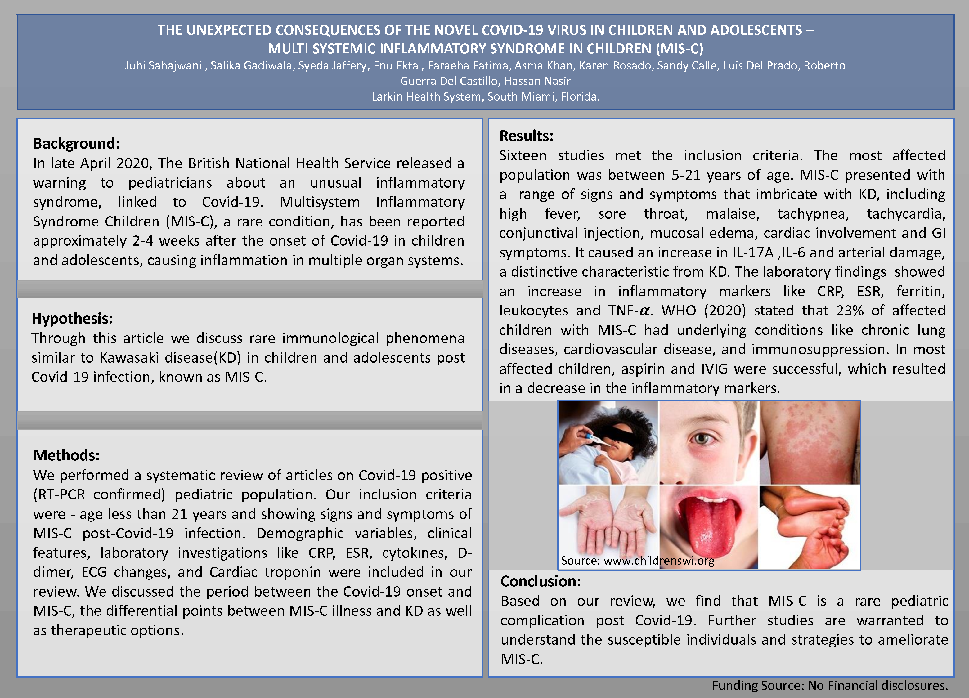 In late April 2020, The British National Health Service released a warning to pediatricians about an unusual inflammatory syndrome, linked to Covid-19Multisystem Inflammatory Syndrome in Children(MIS-C), a rare condition, has been reported approximately 2-4 weeks after the onset of Covid-19 in children and adolescents, causing inflammation in multiple organ systems.