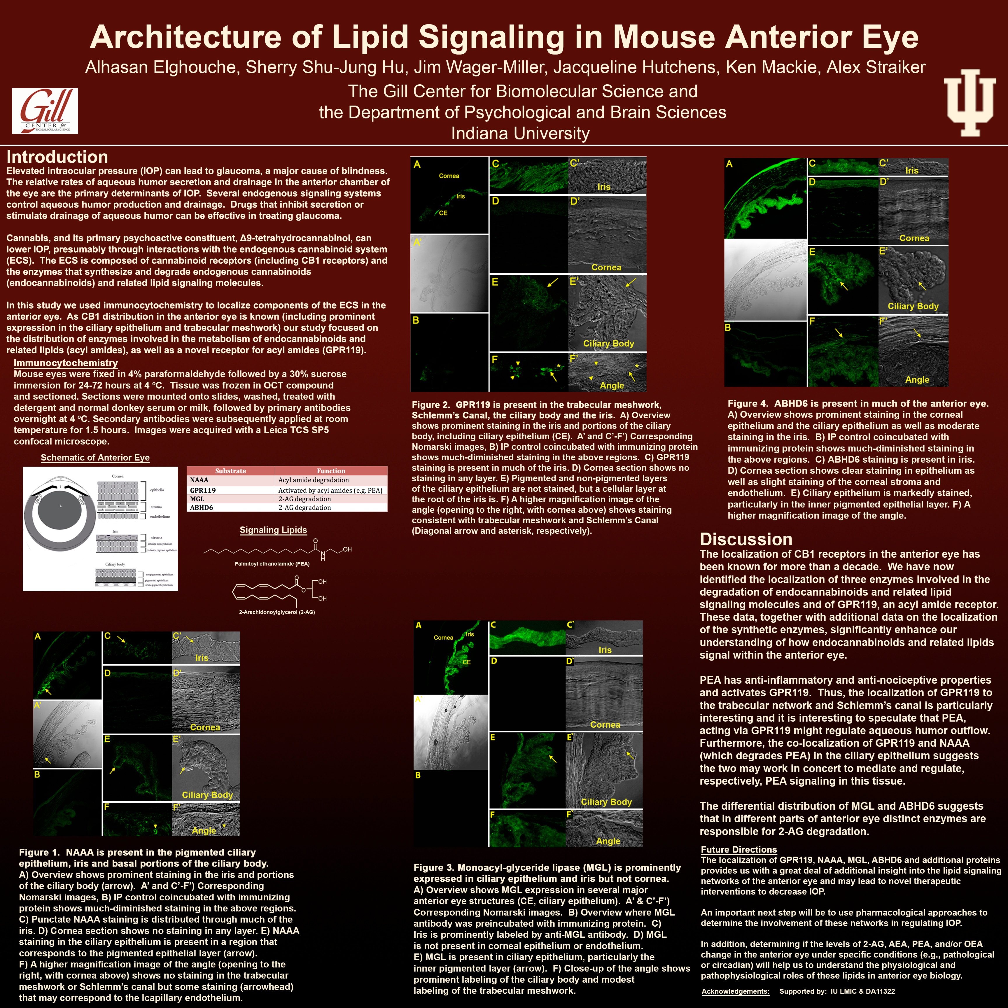 In this study we used immunocytochemistry to localize components of the ECS in the anterior eye. As CB1 distribution in the anterior eye is known (including prominent expression in the ciliary epithelium and trabecular meshwork) our study focused on the distribution of enzymes involved in the metabolism of endocannabinoids and related lipids (acyl amides), as well as a novel receptor for acyl amides (GPR119).