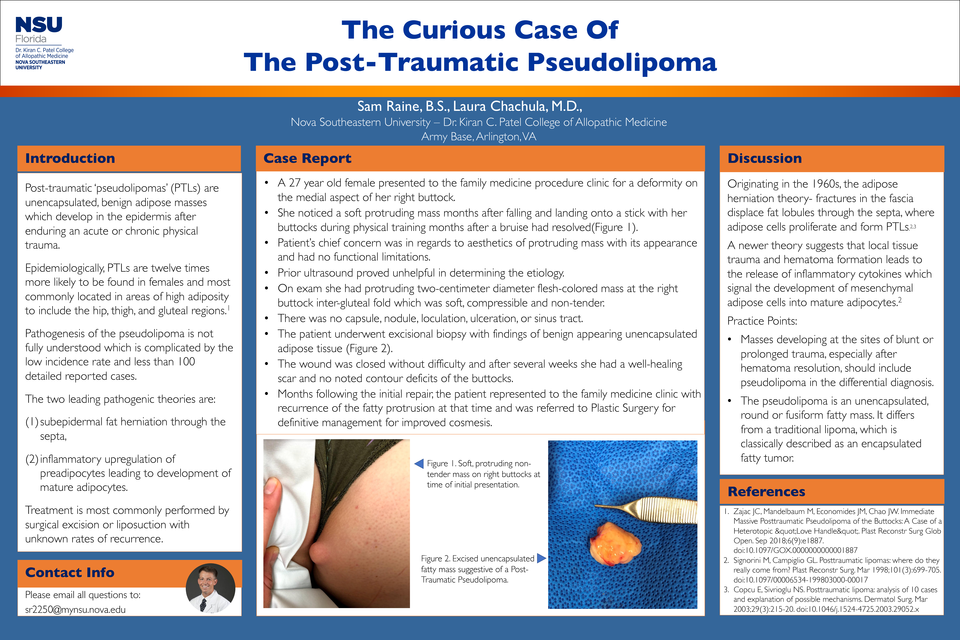 A 27-year-old female presented to the family medicine clinic for a deformity of her right buttock. She first noticed a soft protruding mass months after landing on her buttocks onto a stick during physical training. Prior ultrasound proved unhelpful in determining the etiology. On physical exam she had a two-centimeter, flesh-colored protruding mass at the right buttock inter-gluteal fold which was soft, compressible and non-tender. There was no capsule, nodule, loculation or sinus tract. The patient underwent excisional biopsy with findings of benign appearing unencapsulated adipose tissue. The wound was closed and after several weeks she had a well-healing scar and no noted contour deficits of the buttocks. Months following the initial repair, the patient returned to the family medicine clinic with recurrence of the fatty protrusion and was referred to Plastic Surgery for definitive management.