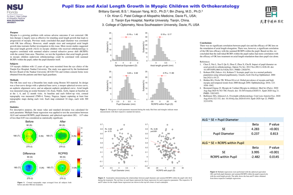 Methods: 119 myopic children aged 12 were recruited from the eye clinics of the Tianjin Eye Hospital, Nankai University. The mean baseline spherical equivalent (SE) was -3.19±1.45 D. The orthokeratology lens used was a Dreamlite lens made using Boston XO material with a four-curve design. Axial length was measured using an ocular biometer baseline and 12-month visits. Corneal topography was taken at these visits, and pupil size was measured from the topographic maps. Multiple linear regression was applied to test the association between ALG and summed RCRPS, pupil diameter (PD), and SE. A P-value of <0.05 was considered statistically significant.