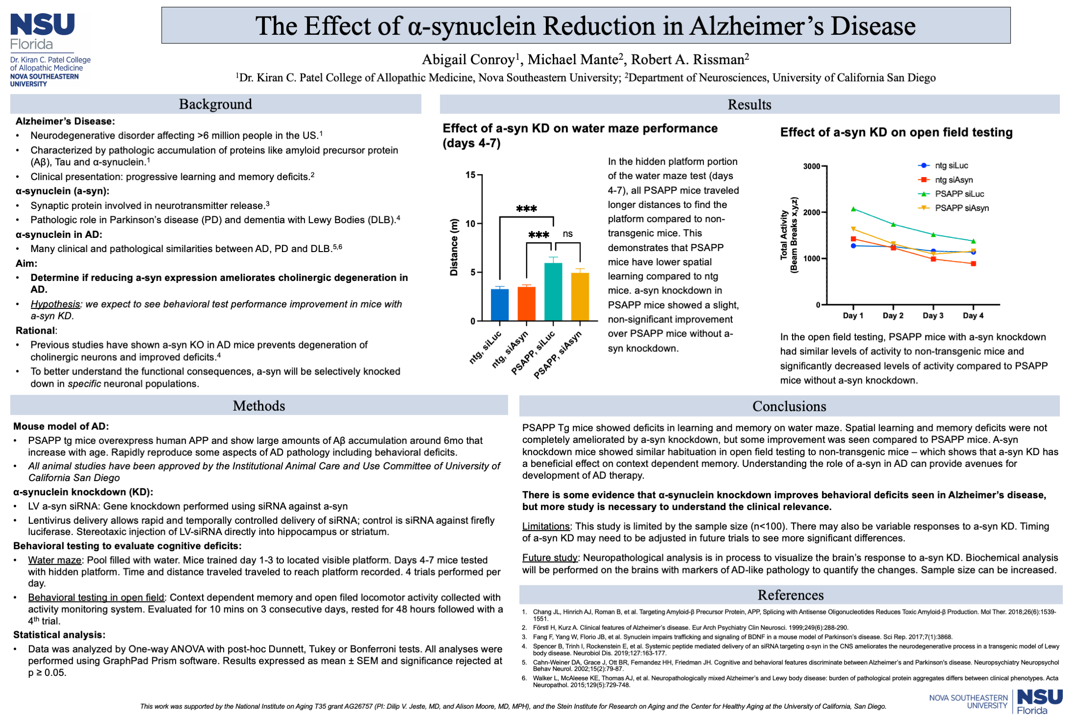 There is some evidence that α-synuclein knockdown improves behavioral deficits seen in Alzheimer’s disease, but more study is necessary to understand the clinical relevance. Understanding the role of a-syn in AD has implications for the future development of AD therapy. This study is limited by sample size (n<100) and future studies may see significant results with a larger n. The neuropathological analysis is ongoing and will help to better understand the brain’s response to a-syn KD.