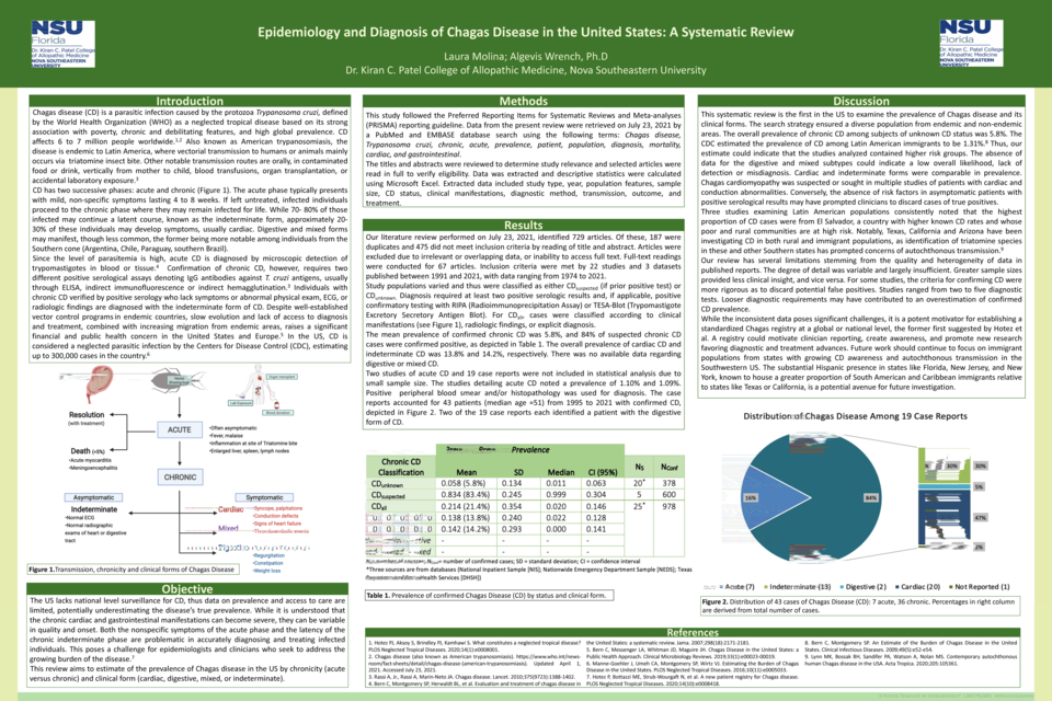 OUTCOMES: We obtained 729 studies from our search, analyzing 22 studies and 3 datasets reporting both acute and chronic CD cases in the US from 1991-2021. Chronic cases were classified as cardiac, digestive, mixed, or indeterminate. Average prevalence of confirmed chronic CD was 5.8%. We reviewed an additional 19 case reports of 43 CD cases, of which 84% were chronic, mostly cardiac.