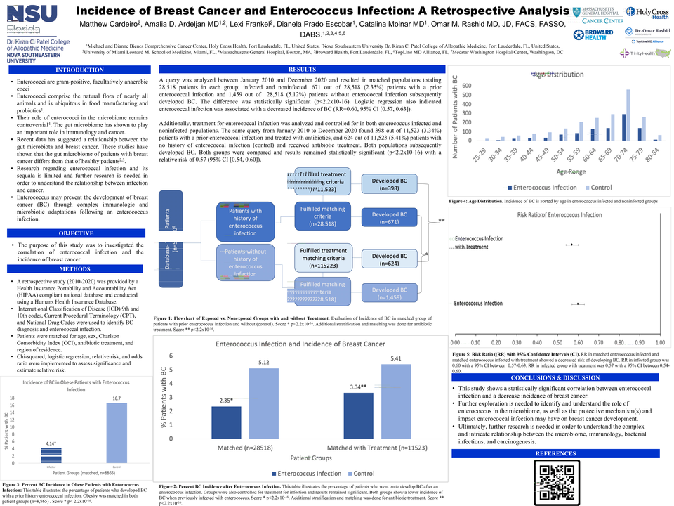 Discussion: This study shows a statistically significant correlation between enterococcus infection and decreased incidence of BC. Further exploration is needed to identify and understand not only the role of enterococcus in the microbiome, but also the protective mechanism(s) and impact enterococcus infection may have on BC development.