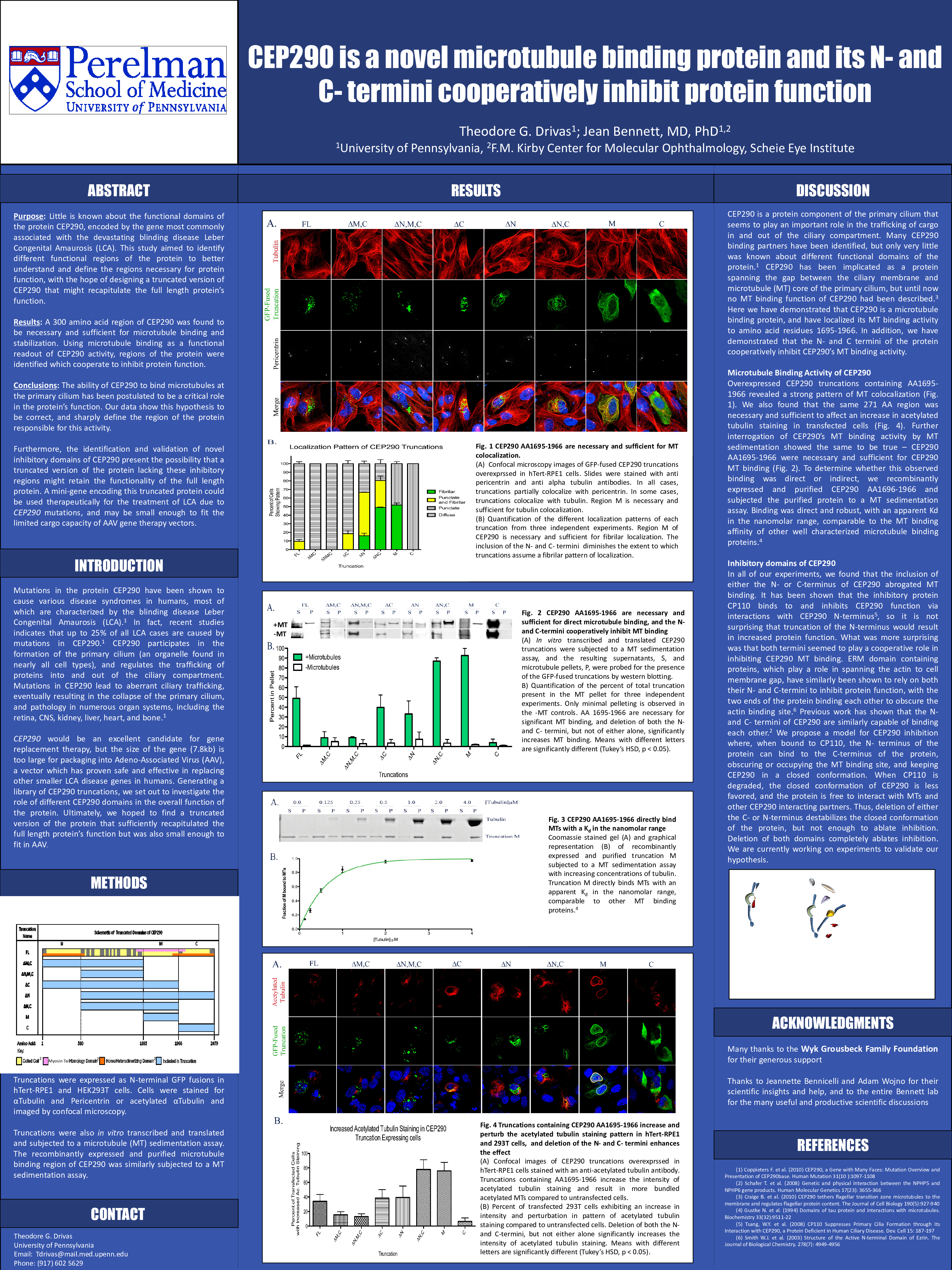 Purpose: Little is known about the functional domains of the protein CEP290, encoded by the gene most commonly associated with the devastating blinding disease Leber Congenital Amaurosis (LCA). This study aimed to identify different functional regions of the protein to better understand and define the regions necessary for protein function, with the hope of designing a truncated version of CEP290 that might recapitulate the full length protein’s function. Results: A 300 amino acid region of CEP290 was found to be necessary and sufficient for microtubule binding and stabilization. Using microtubule binding as a functional readout of CEP290 activity, regions of the protein were identified which cooperate to inhibit protein function. Conclusions: The ability of CEP290 to bind microtubules at the primary cilium has been postulated to be a critical role in the protein’s function. Our data show this hypothesis to be correct, and sharply define the region of the protein responsible for this activity. Furthermore, the identification and validation of novel inhibitory domains of CEP290 present the possibility that a truncated version of the protein lacking these inhibitory regions might retain the functionality of the full length protein. A mini-gene encoding this truncated protein could be used therapeutically for the treatment of LCA due to CEP290 mutations, and may be small enough to fit the limited cargo capacity of AAV gene therapy vectors.