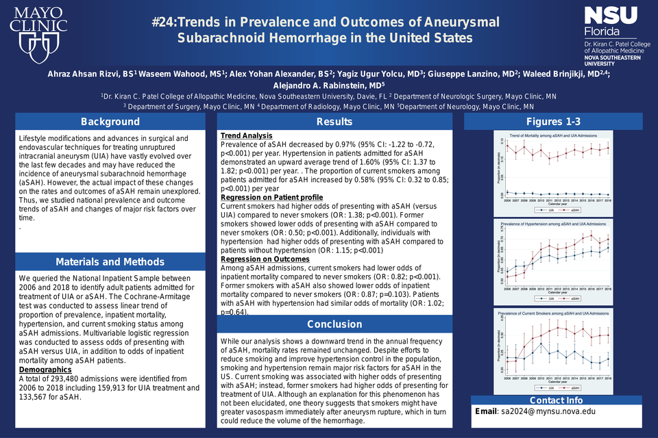 Despite a downward trend in the annual frequency of hospitalizations for aSAH, inpatient mortality rates have remained unchanged in the US. Smoking and hypertension are increasingly prevalent among patients with aSAH. Thus, efforts to control these modifiable risk factors must be further strengthened.